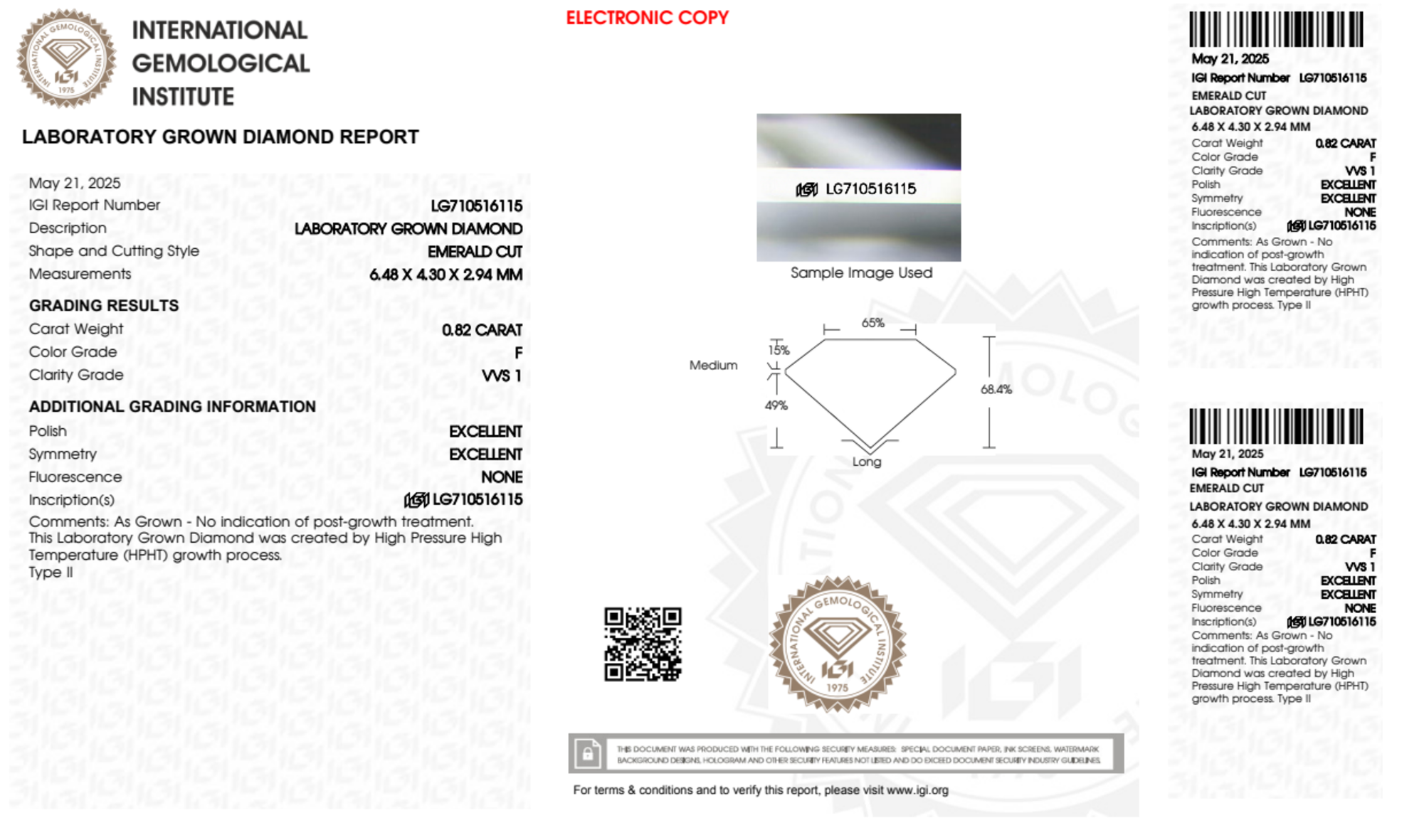 Your 0.82 carat Emerald lab diamond is graded F color (Colorless), and you can read more about F color diamonds here.