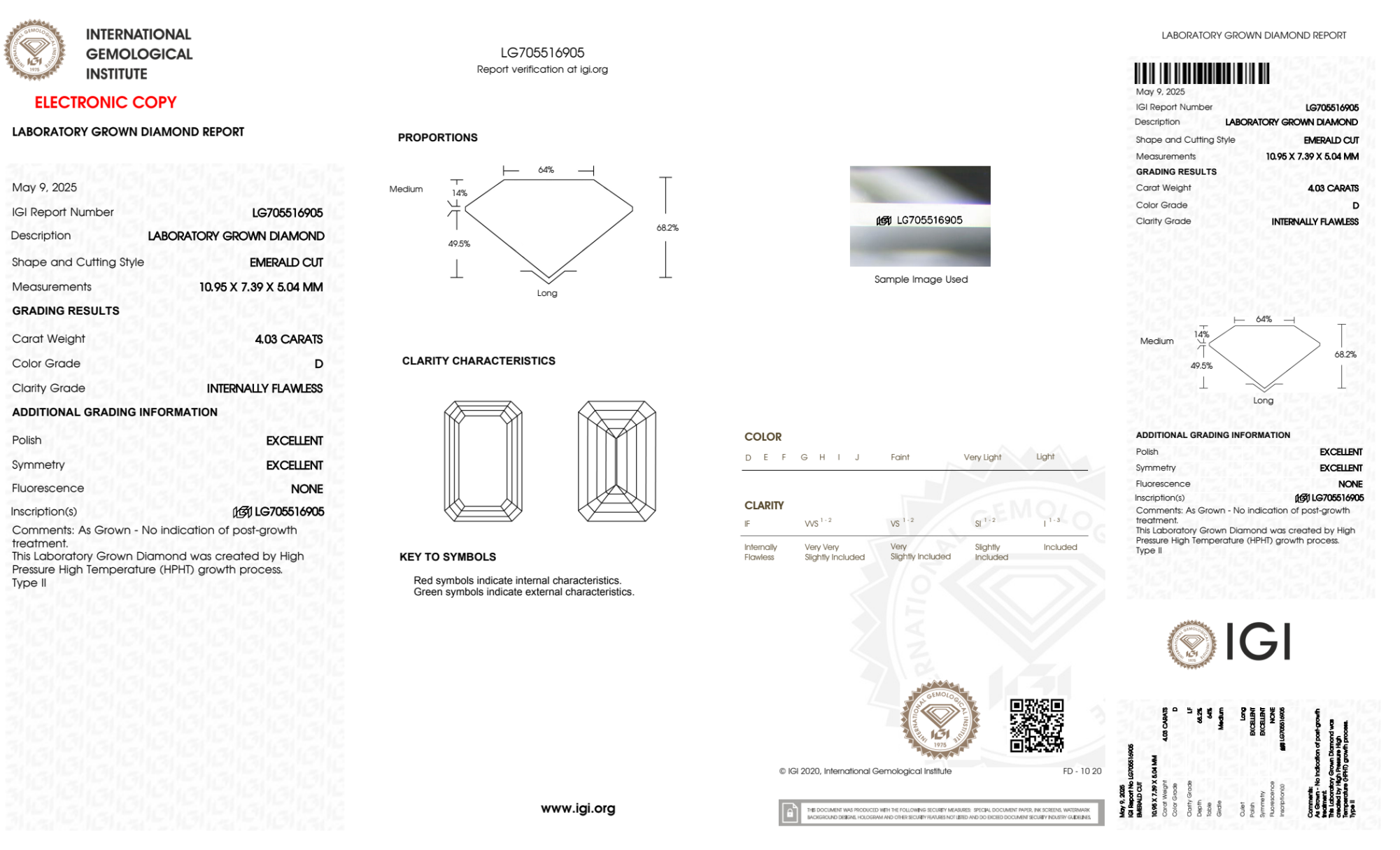 Your 4.03 carat Emerald lab diamond is graded IF clarity, which stands for Internally Flawless. Read more about IF clarity diamonds here, or learn more about diamond clarity in general here.