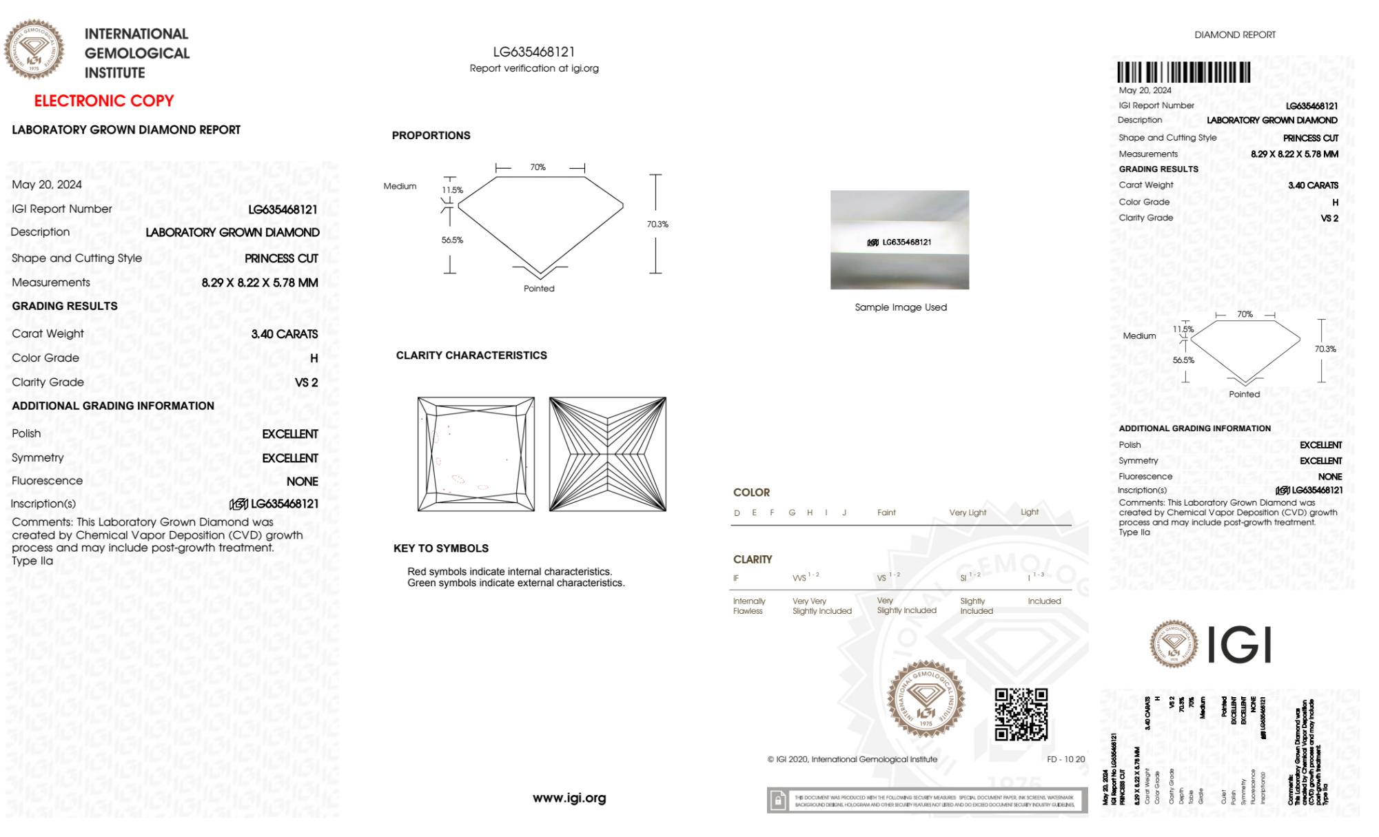 Your 3.40 carat Princess lab diamond is graded VS2 clarity, which stands for Very Slightly Included 2. Read more about VS2 clarity diamonds here, or learn more about diamond clarity in general here.