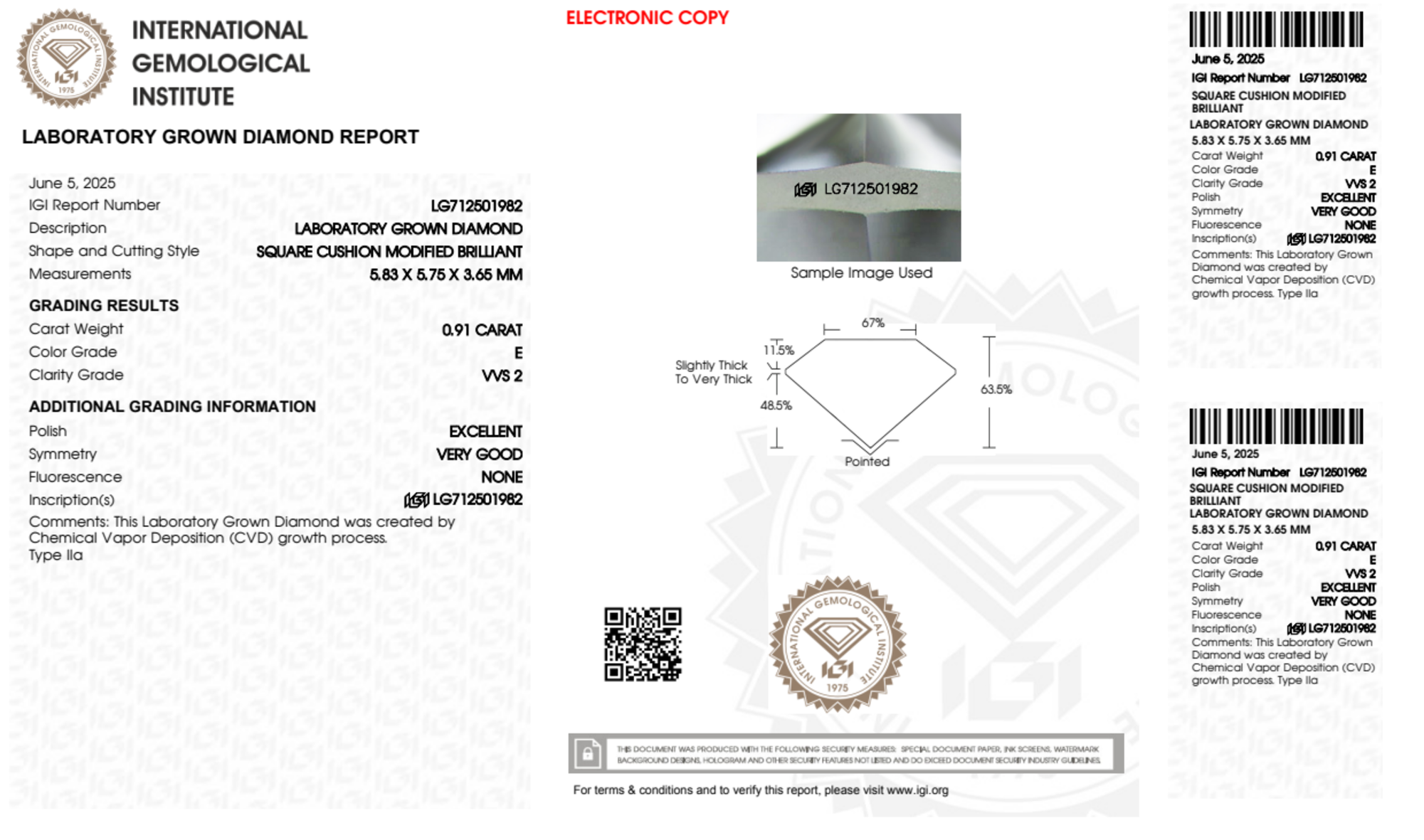 Your 0.91 carat Cushion lab diamond is graded E color (Colorless), and you can read more about E color diamonds here.
