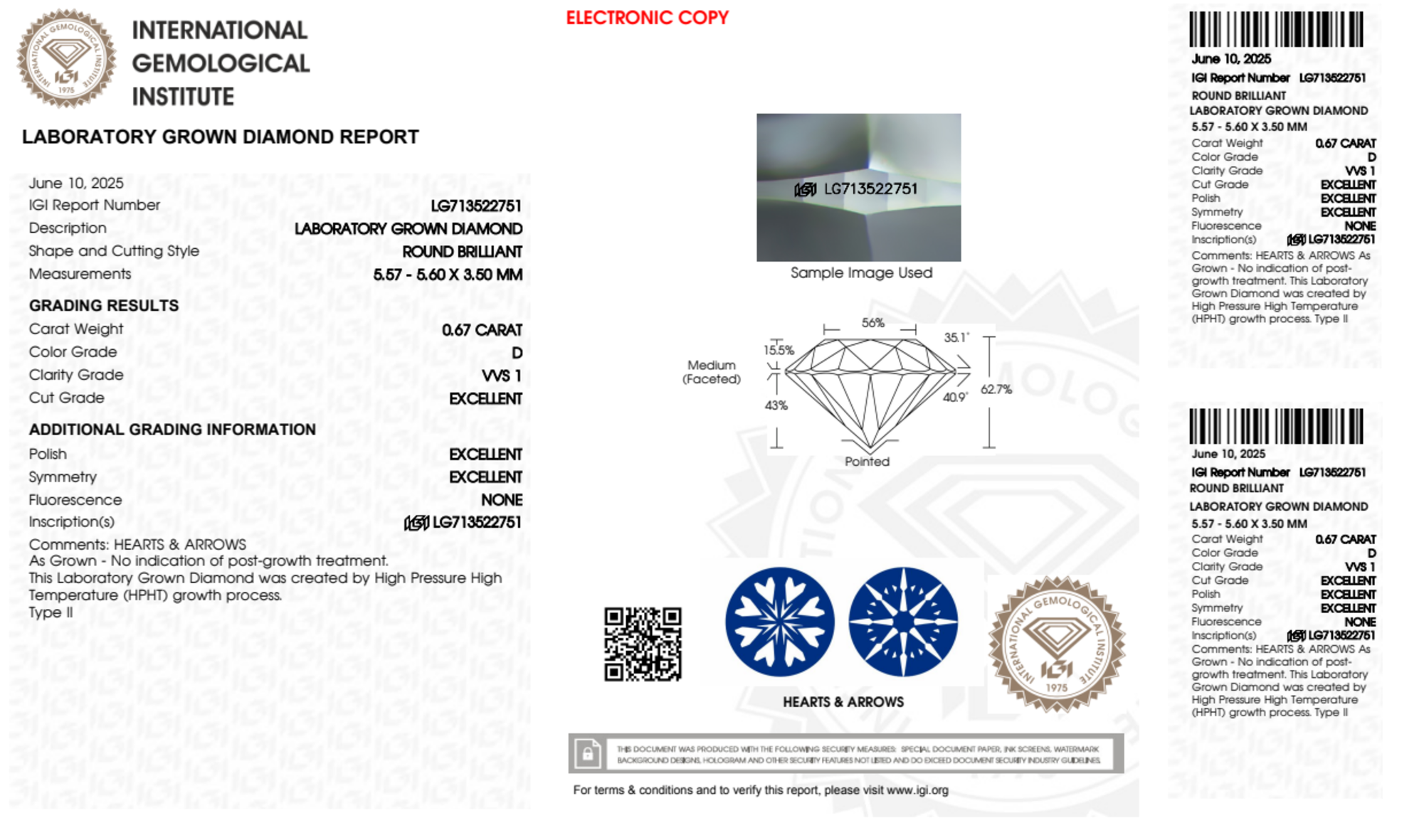 Your 0.67 carat Round lab diamond is graded VVS1 clarity, which stands for Very Very Slightly Included 1. Read more about VVS1 clarity diamonds here, or learn more about diamond clarity in general here.