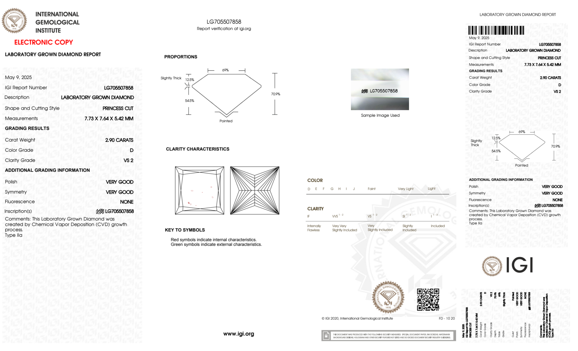 Your 2.90 carat Princess lab diamond is graded VS2 clarity, which stands for Very Slightly Included 2. Read more about VS2 clarity diamonds here, or learn more about diamond clarity in general here.