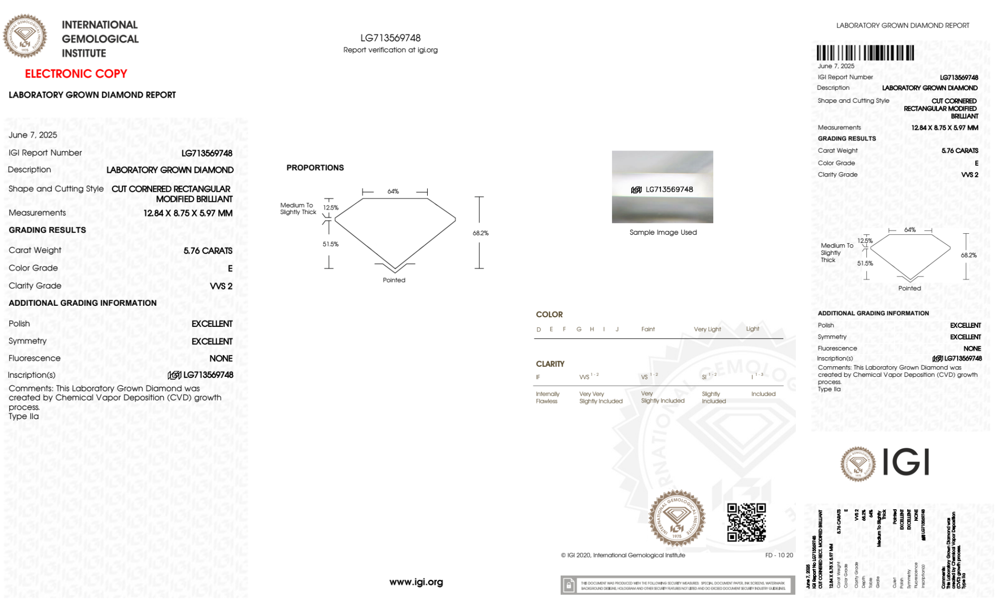 Your 5.76 carat Radiant lab diamond is graded E color (Colorless), and you can read more about E color diamonds here.
