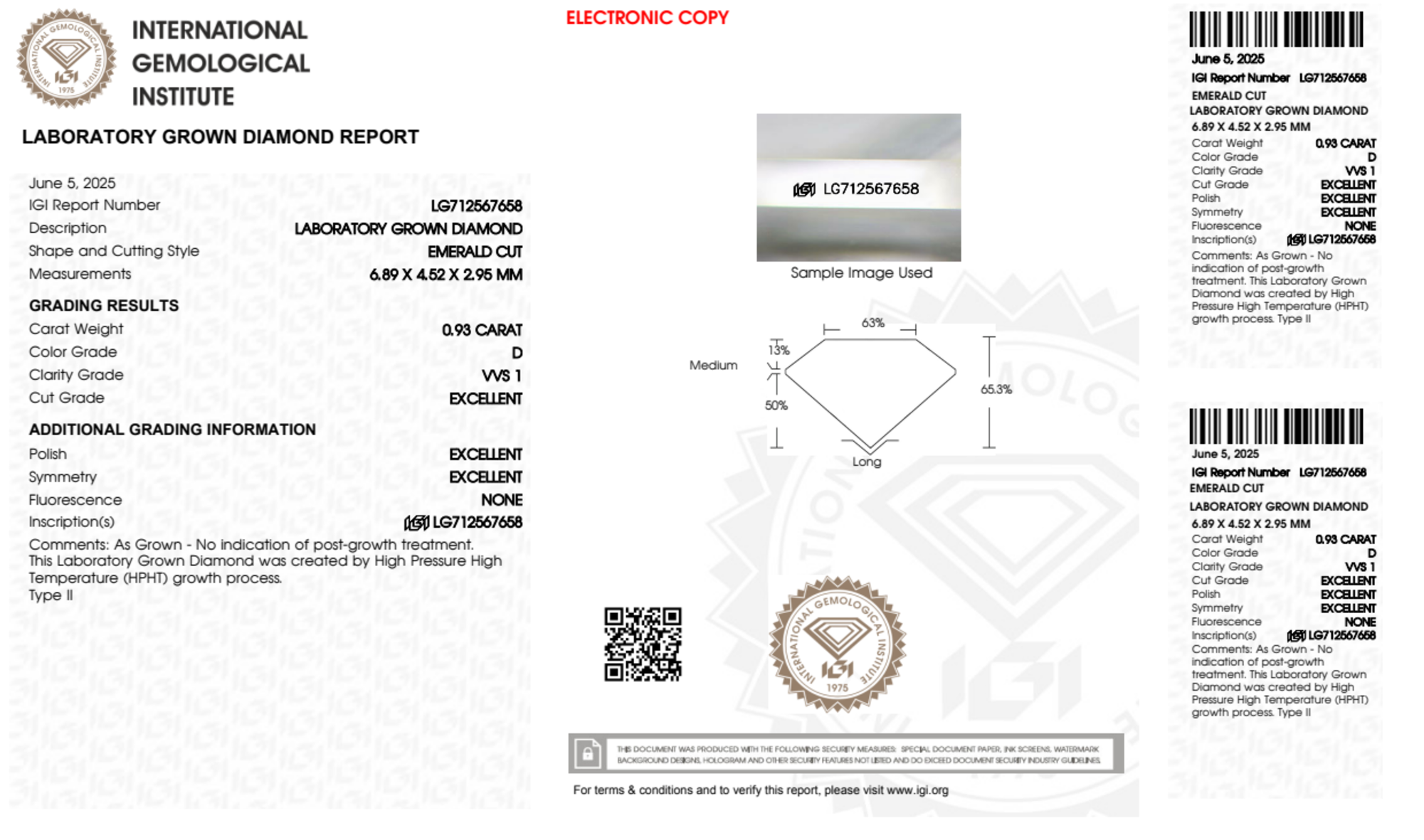 Your 0.93 carat Emerald lab diamond is graded D color (Colorless), and you can read more about D color diamonds here.