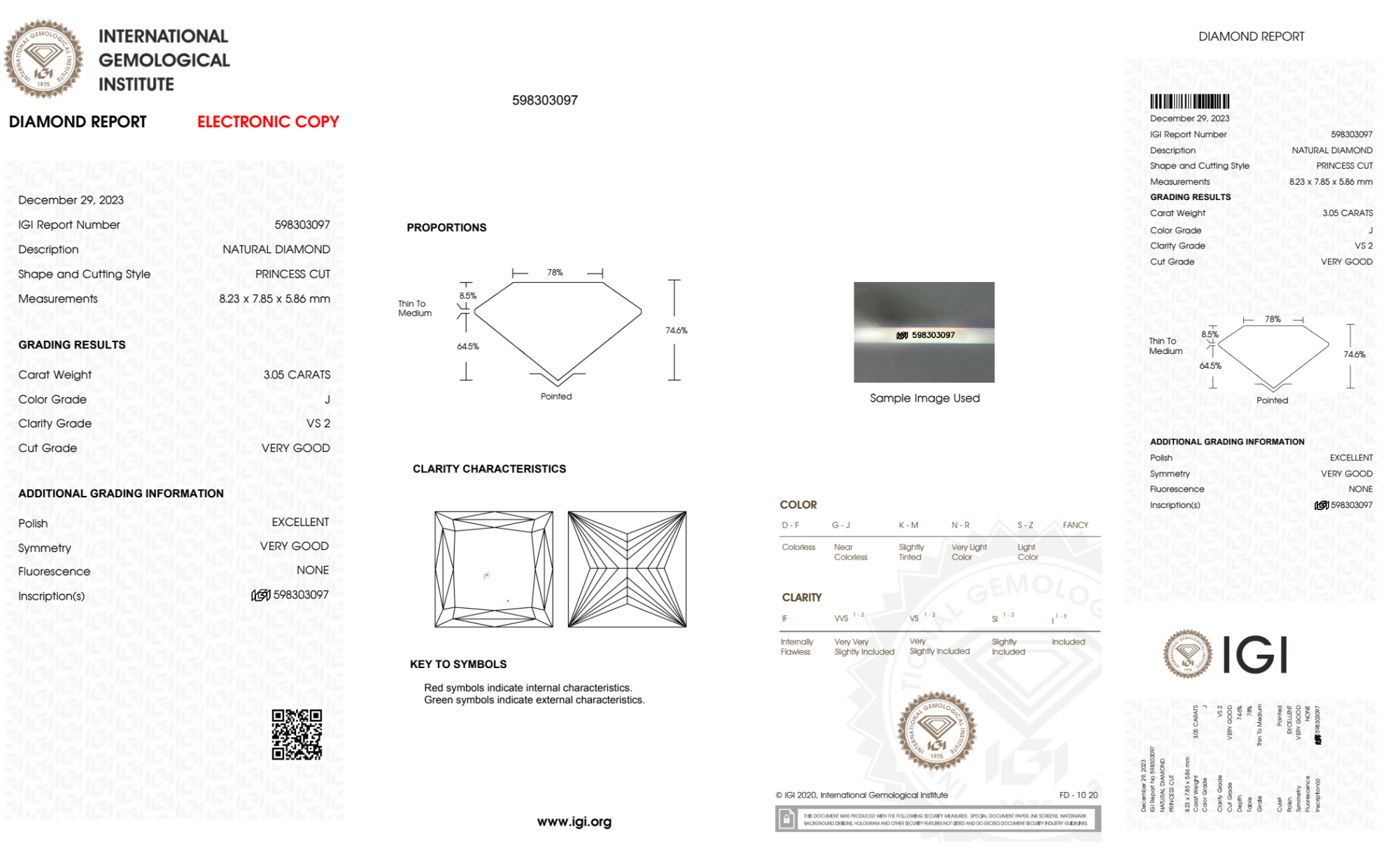 Your 3.05 carat Princess natural diamond is graded VS2 clarity, which stands for Very Slightly Included 2. Read more about VS2 clarity diamonds here, or learn more about diamond clarity in general here.