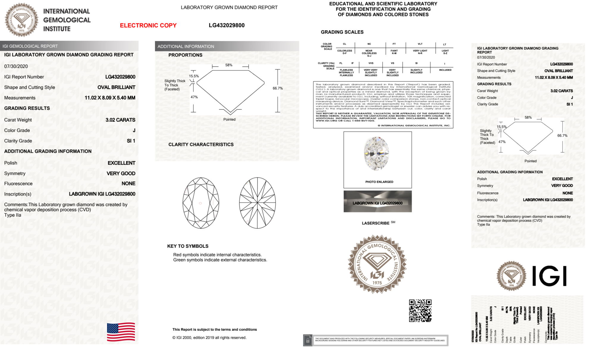 Your 3.02 carat Oval lab diamond is graded J color (Near Colorless), and you can read more about J color diamonds here.