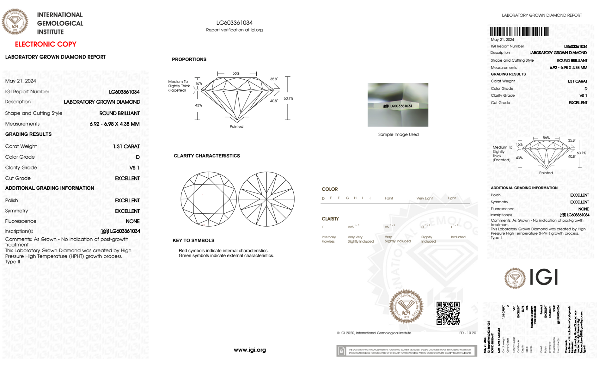 Your 1.31 carat Round lab diamond is graded D color (Colorless), and you can read more about D color diamonds here.