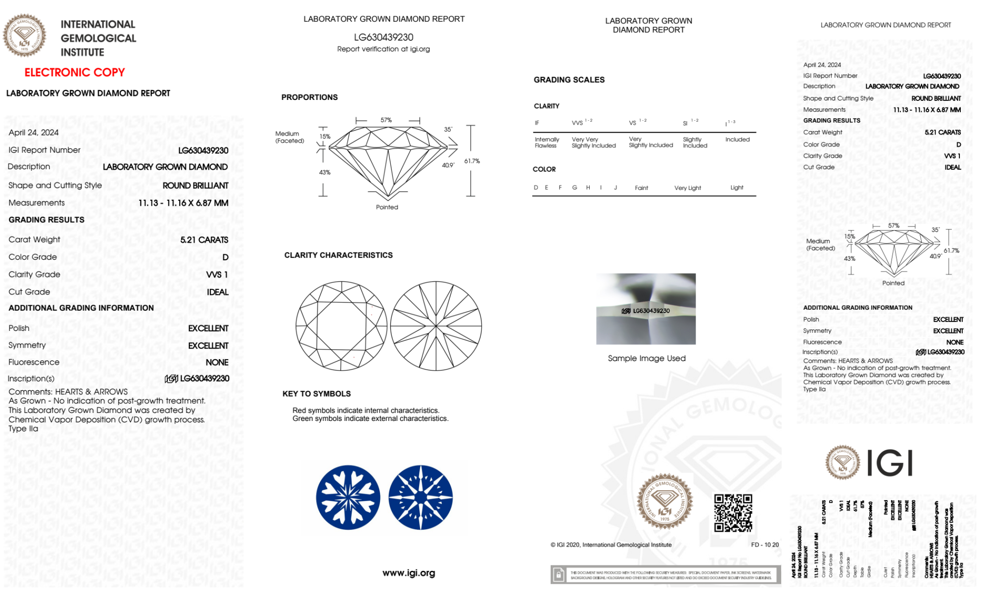 Your 5.21 carat Round lab diamond is graded VVS1 clarity, which stands for Very Very Slightly Included 1. Read more about VVS1 clarity diamonds here, or learn more about diamond clarity in general here.