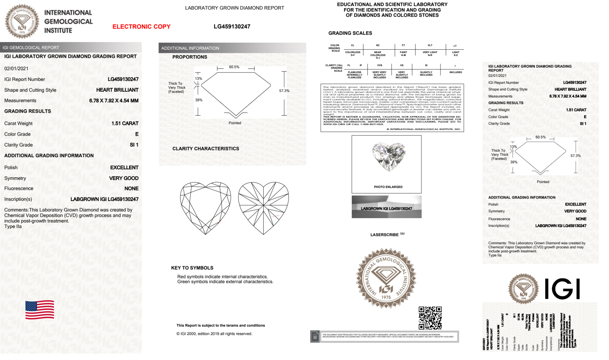 Your 1.51 carat Heart lab diamond is graded E color (Colorless), and you can read more about E color diamonds here.