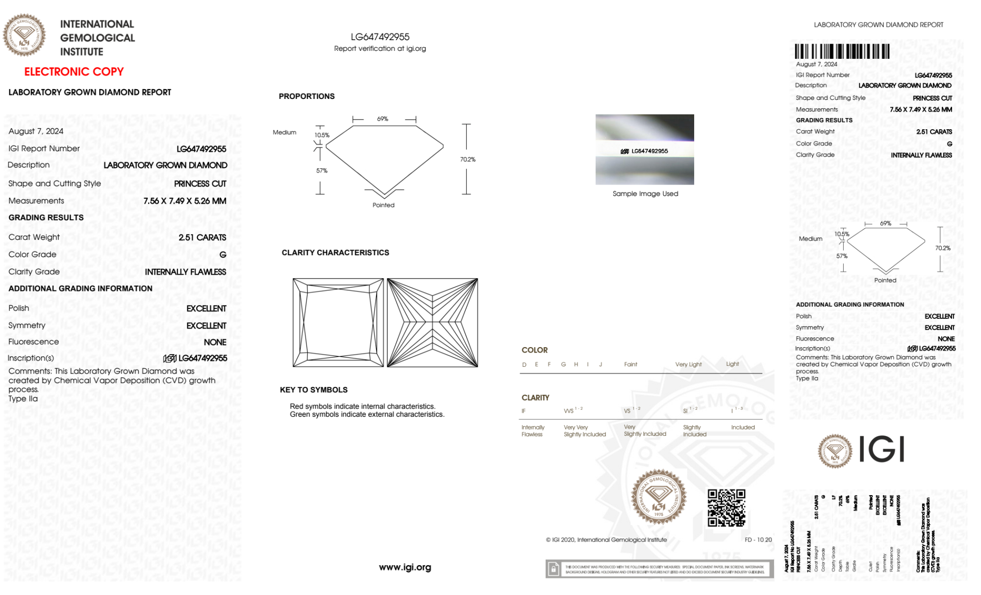 Your 2.51 carat Princess lab diamond is graded IF clarity, which stands for Internally Flawless. Read more about IF clarity diamonds here, or learn more about diamond clarity in general here.