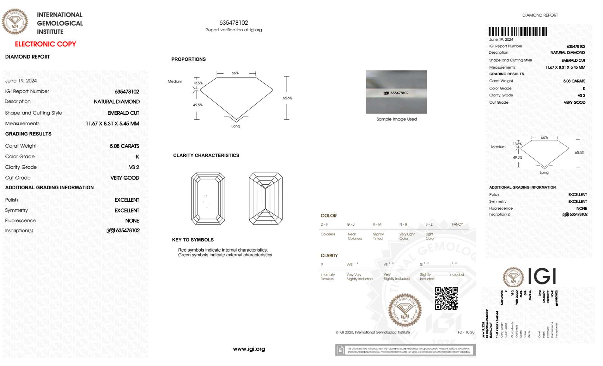 Your 5.08 carat Emerald natural diamond is graded VS2 clarity, which stands for Very Slightly Included 2. Read more about VS2 clarity diamonds here, or learn more about diamond clarity in general here.