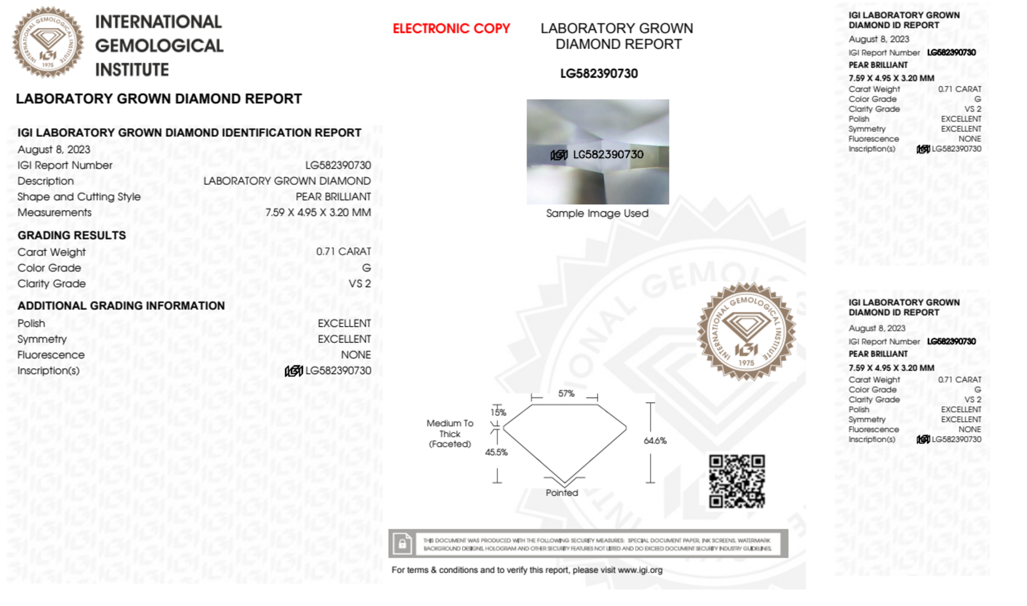 Your 0.71 carat Pear lab diamond is graded G color (Near Colorless), and you can read more about G color diamonds here.