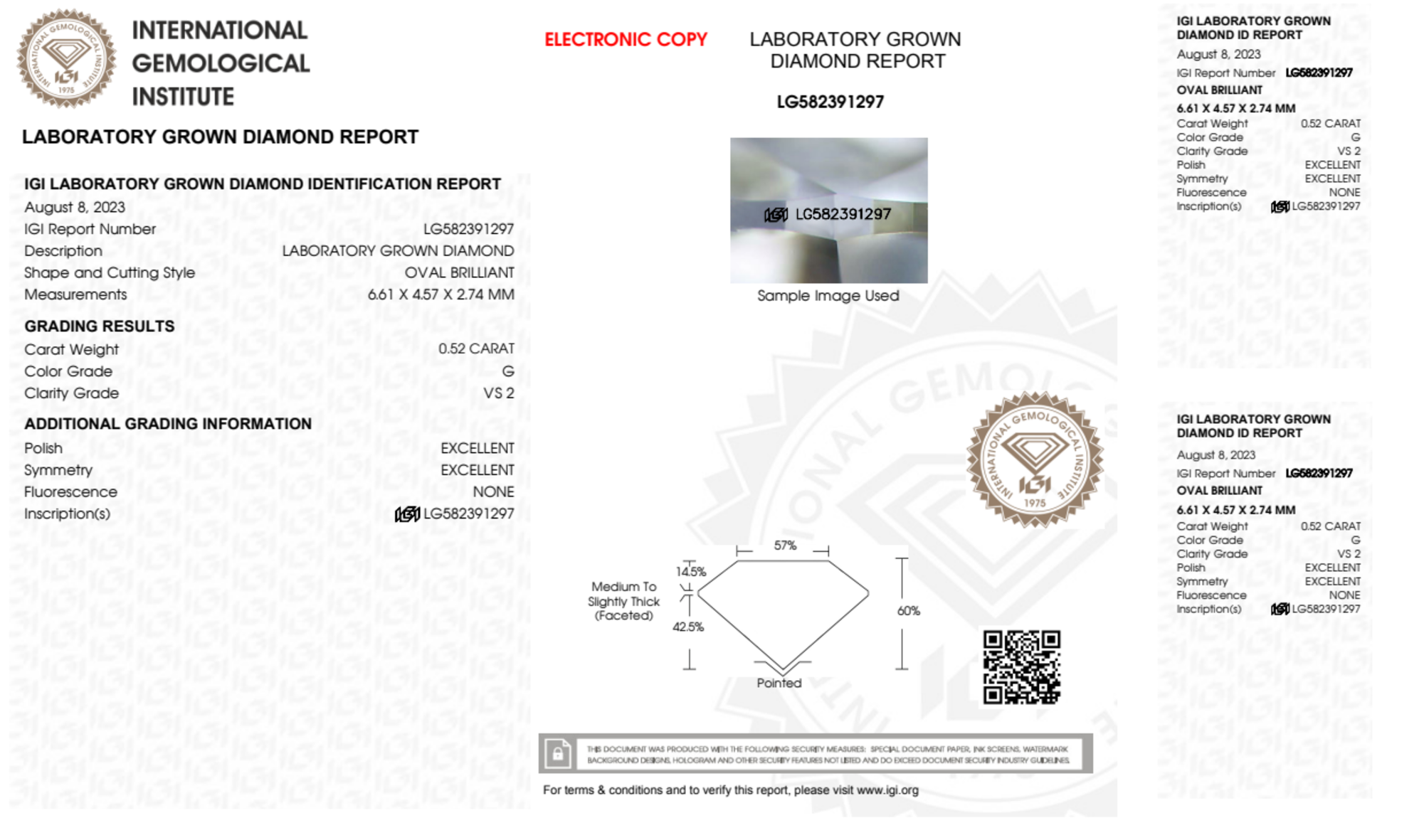 Your 0.52 carat Oval lab diamond is graded G color (Near Colorless), and you can read more about G color diamonds here.