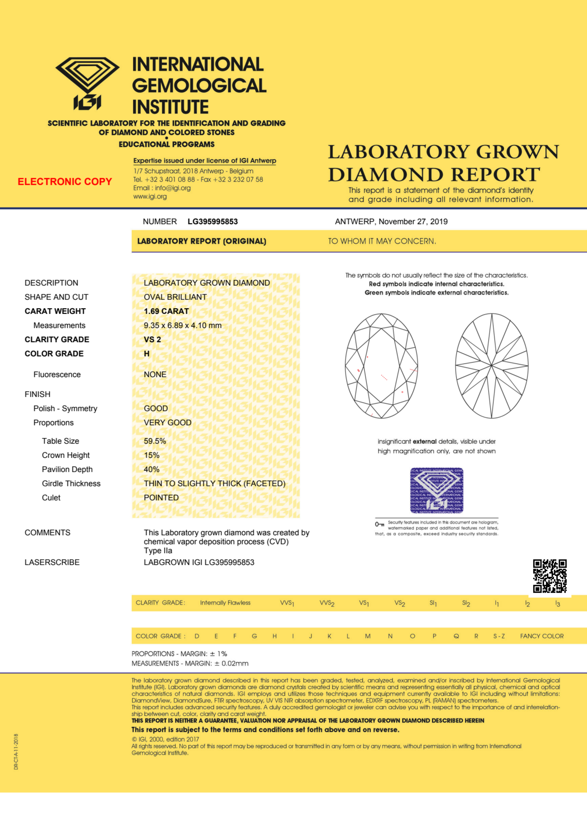 Your 1.69 carat Oval lab diamond is graded H color (Near Colorless), and you can read more about H color diamonds here.