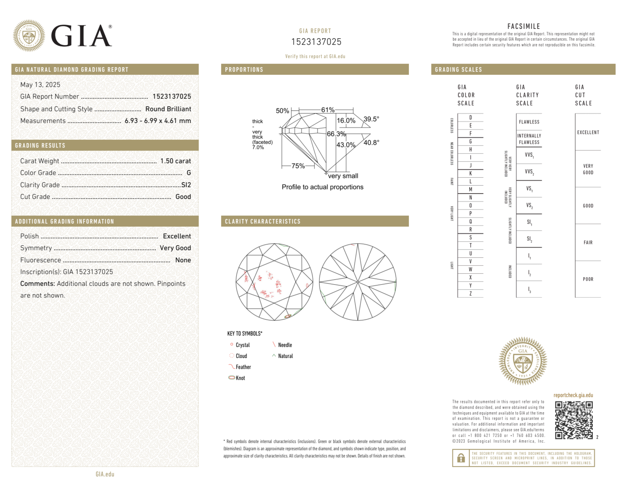 Your 1.50 carat Round natural diamond is graded G color (Near Colorless), and you can read more about G color diamonds here.
