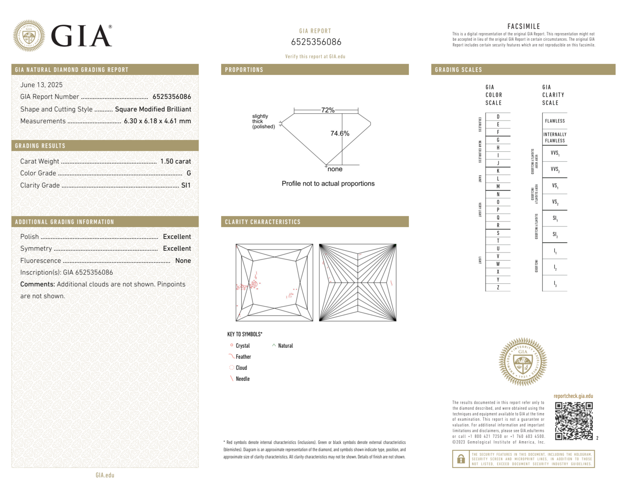 Your 1.50 carat Princess natural diamond is graded SI1 clarity, which stands for Slightly Included 1. Read more about SI1 clarity diamonds here, or learn more about diamond clarity in general here.