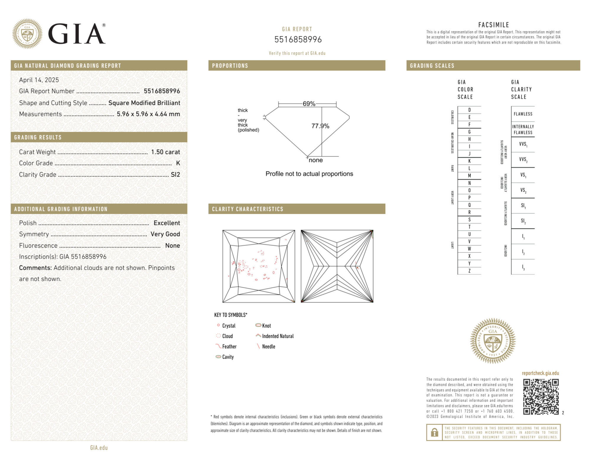 Your 1.50 carat Princess natural diamond is graded SI2 clarity, which stands for Slightly Included 2. Read more about SI2 clarity diamonds here, or learn more about diamond clarity in general here.