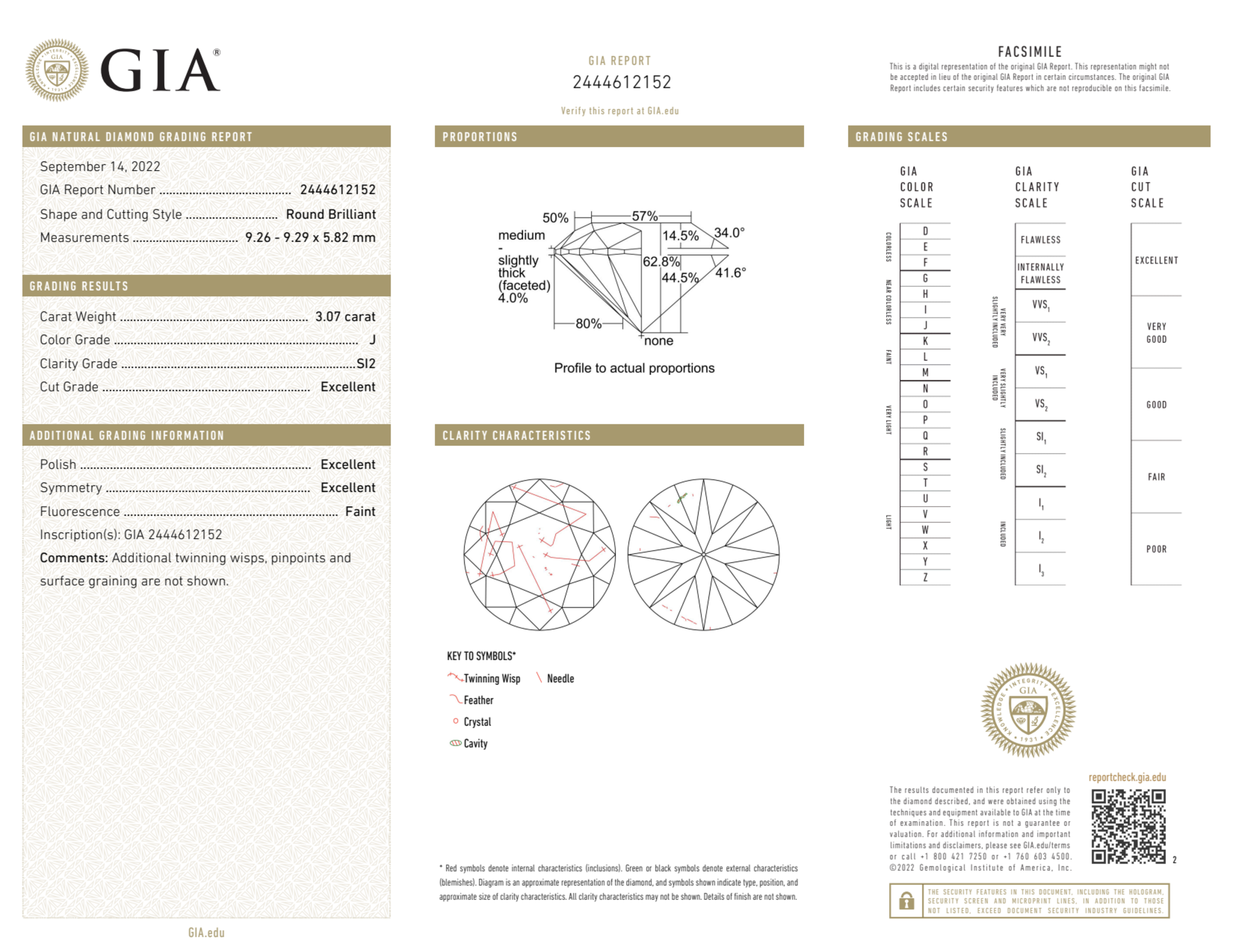 Your 3.07 carat Round natural diamond is graded SI2 clarity, which stands for Slightly Included 2. Read more about SI2 clarity diamonds here, or learn more about diamond clarity in general here.