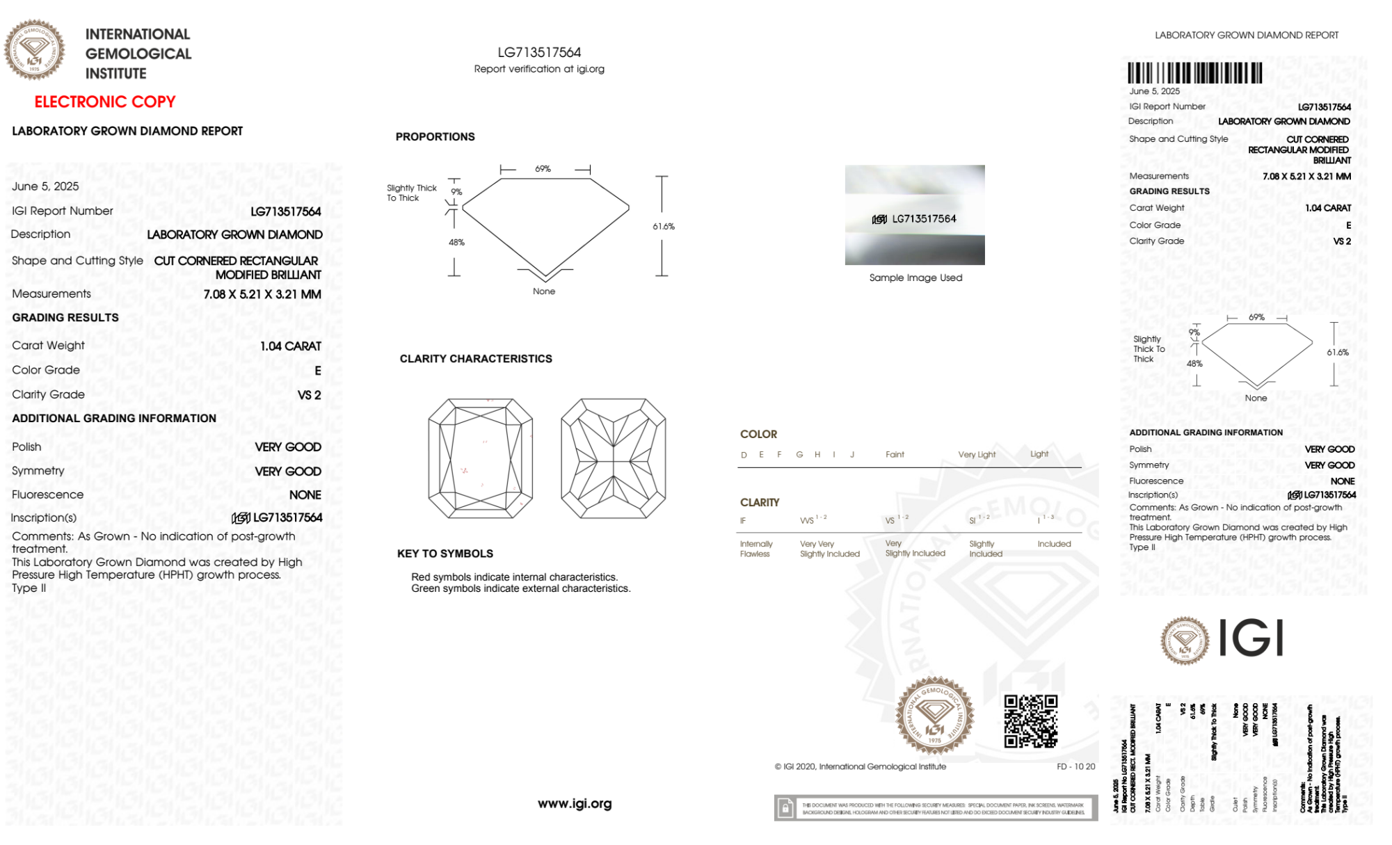 Your 1.04 carat Radiant lab diamond is graded E color (Colorless), and you can read more about E color diamonds here.