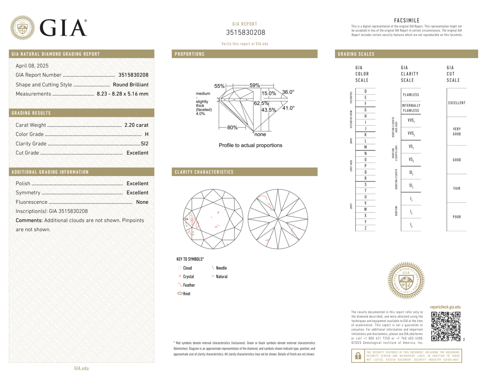 Your 2.20 carat Round natural diamond is graded H color (Near Colorless), and you can read more about H color diamonds here.