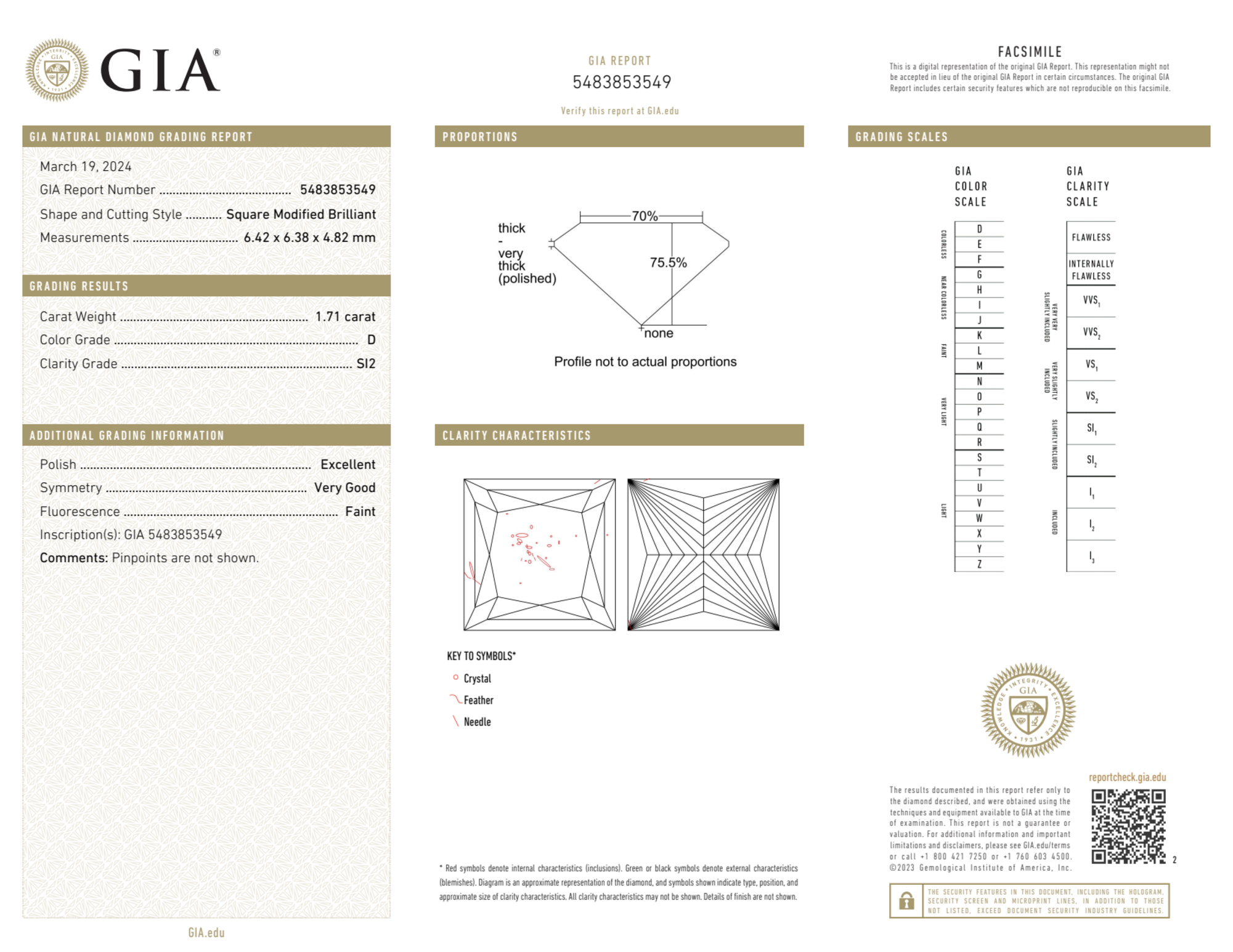 Your 1.71 carat Princess natural diamond is graded D color (Colorless), and you can read more about D color diamonds here.