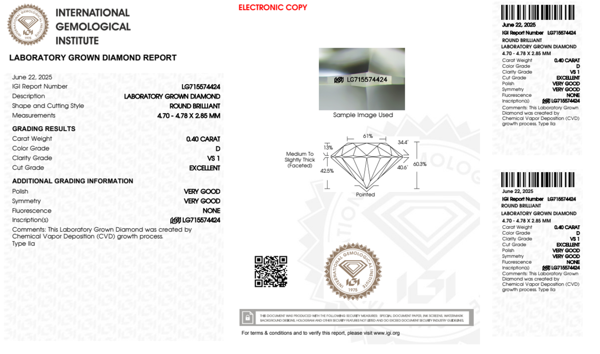 Your 0.40 carat Round lab diamond is graded D color (Colorless), and you can read more about D color diamonds here.