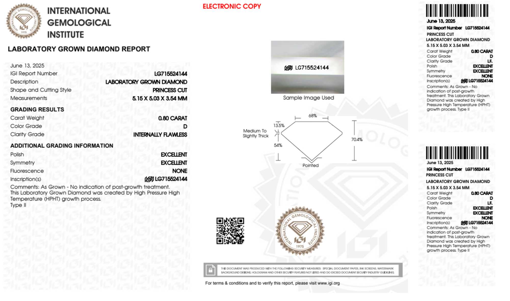 Your 0.80 carat Princess lab diamond is graded IF clarity, which stands for Internally Flawless. Read more about IF clarity diamonds here, or learn more about diamond clarity in general here.