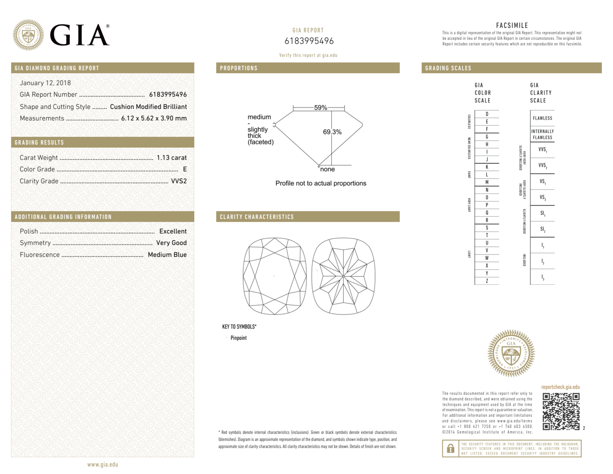 Your 1.13 carat Cushion natural diamond is graded E color (Colorless), and you can read more about E color diamonds here.