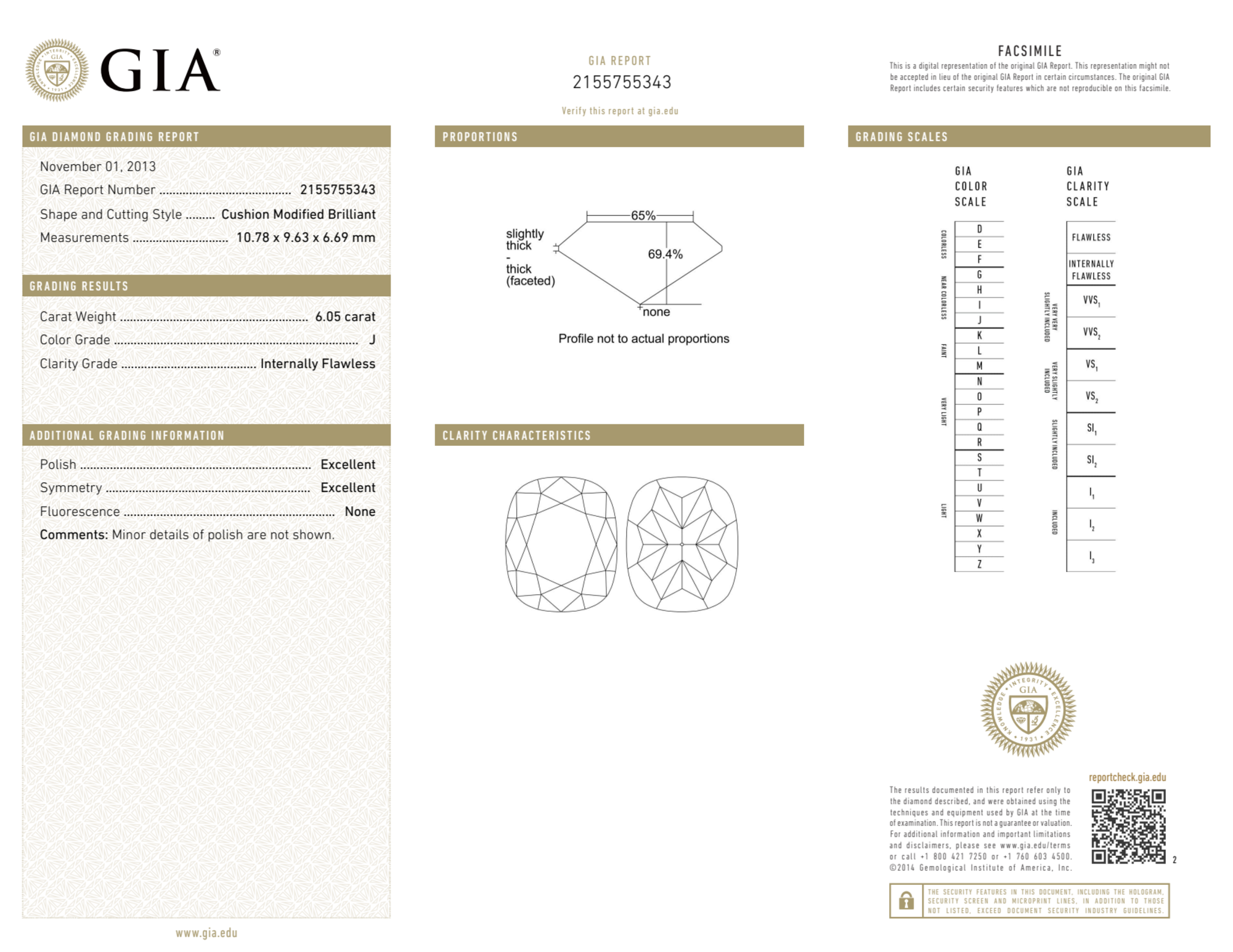 Your 6.05 carat Cushion natural diamond is graded IF clarity, which stands for Internally Flawless. Read more about IF clarity diamonds here, or learn more about diamond clarity in general here.