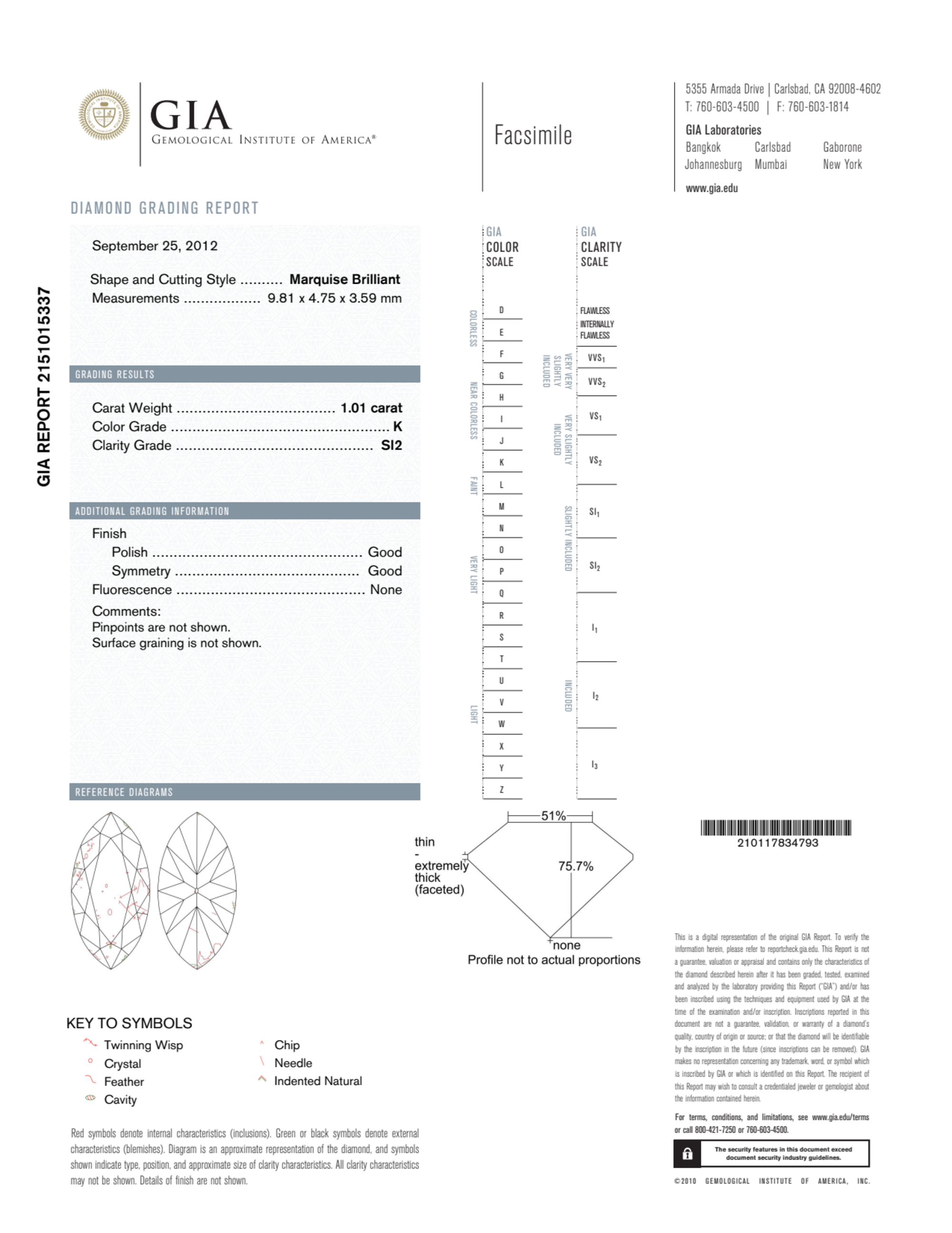 Your 1.01 carat Marquise natural diamond is graded K color (Faint Color), and you can read more about K color diamonds here.