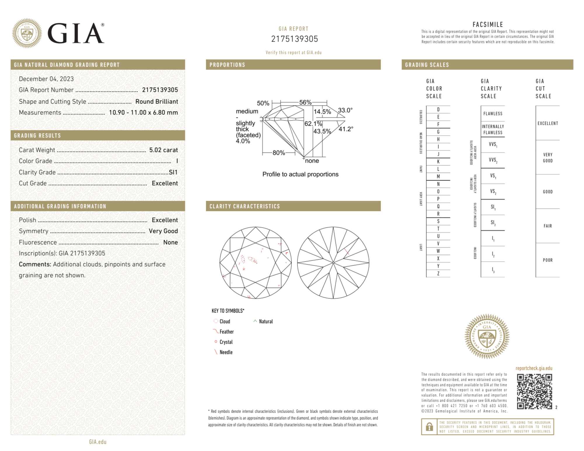 Your 5.02 carat Round natural diamond is graded SI1 clarity, which stands for Slightly Included 1. Read more about SI1 clarity diamonds here, or learn more about diamond clarity in general here.