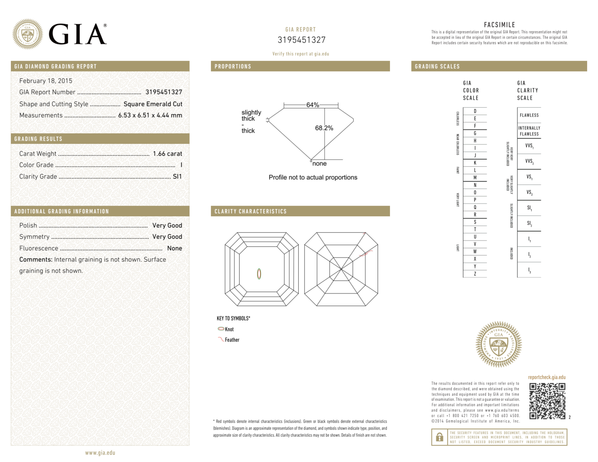 Your 1.66 carat Asscher natural diamond is graded SI1 clarity, which stands for Slightly Included 1. Read more about SI1 clarity diamonds here, or learn more about diamond clarity in general here.