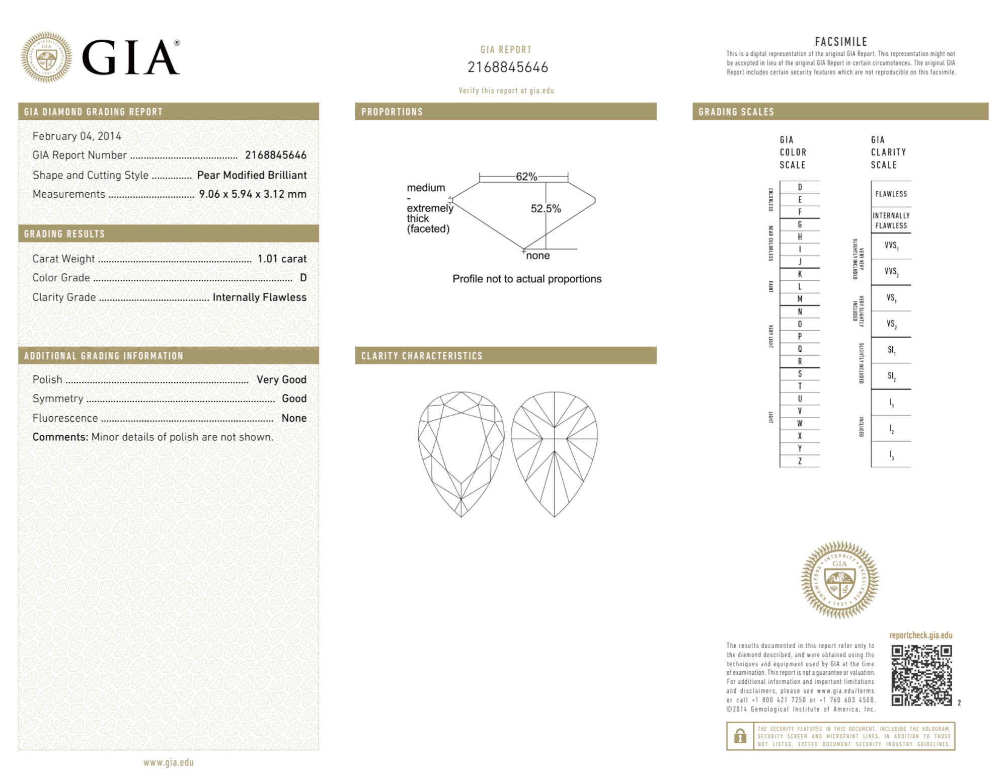 Your 1.01 carat Pear natural diamond is graded IF clarity, which stands for Internally Flawless. Read more about IF clarity diamonds here, or learn more about diamond clarity in general here.