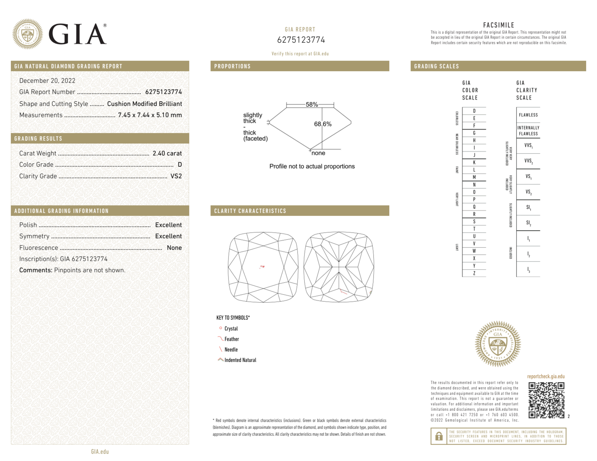 Your 2.40 carat Cushion natural diamond is graded D color (Colorless), and you can read more about D color diamonds here.