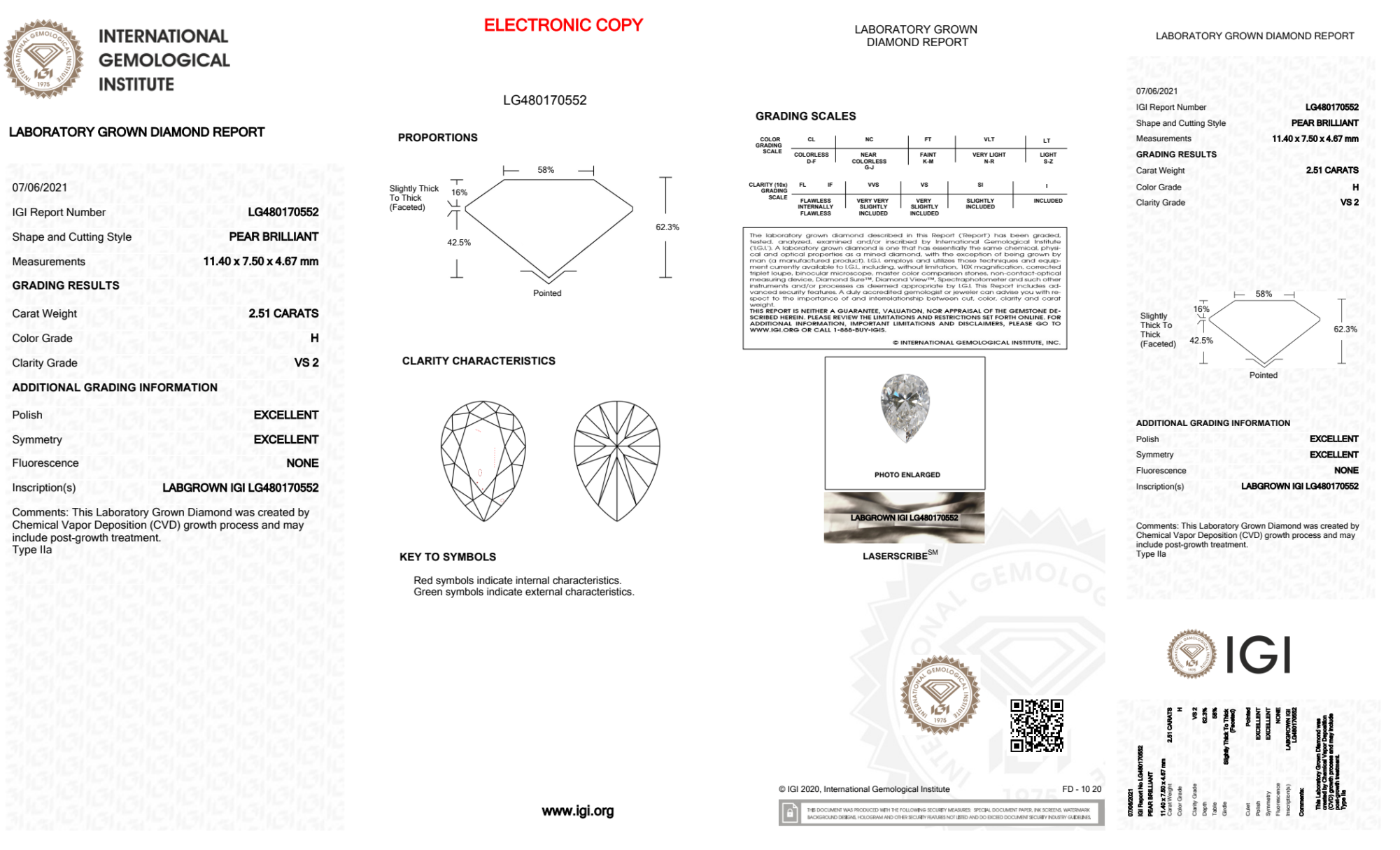 Your 2.51 carat Pear lab diamond is graded H color (Near Colorless), and you can read more about H color diamonds here.