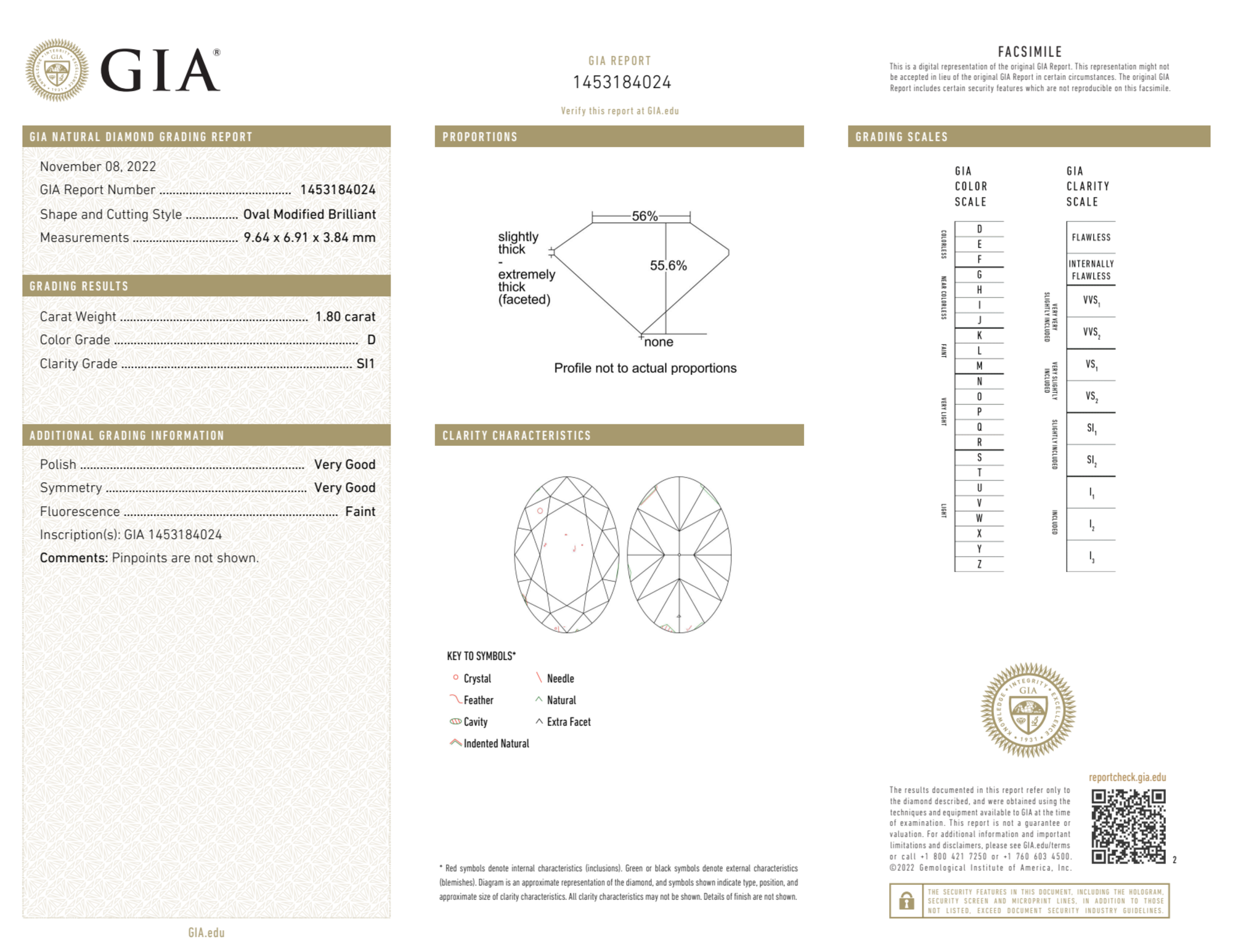 Your 1.80 carat Oval natural diamond is graded D color (Colorless), and you can read more about D color diamonds here.