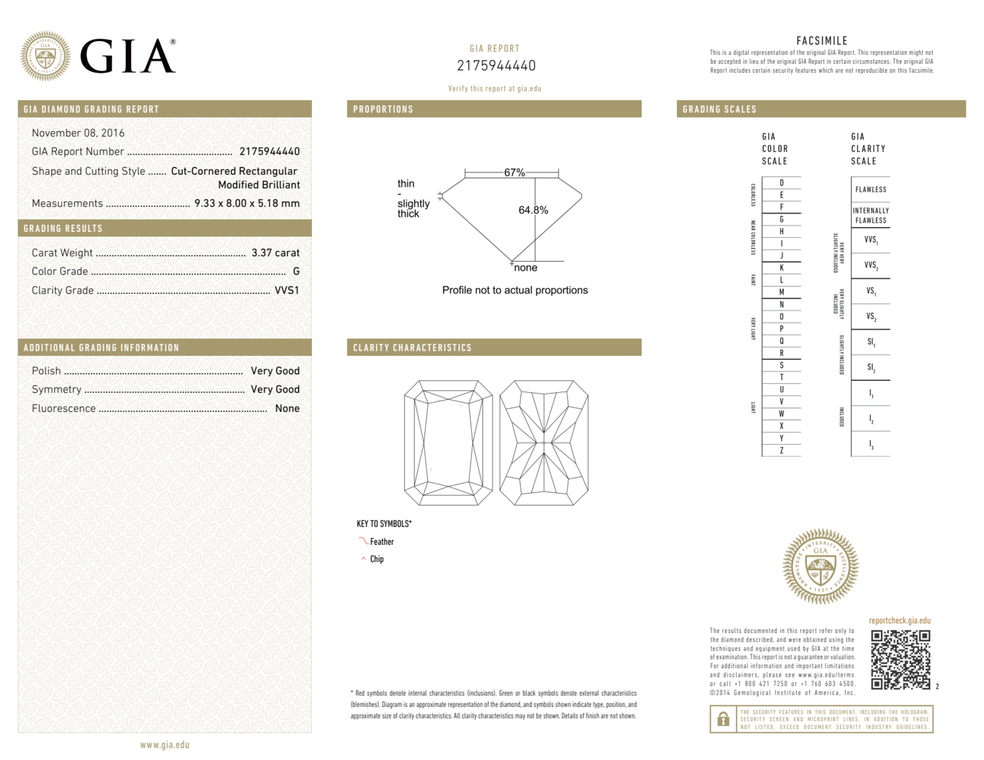 Your 3.37 carat Radiant natural diamond is graded VVS1 clarity, which stands for Very Very Slightly Included 1. Read more about VVS1 clarity diamonds here, or learn more about diamond clarity in general here.