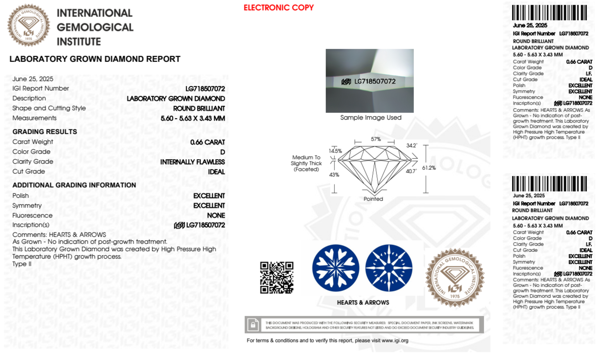 Your 0.66 carat Round lab diamond is graded IF clarity, which stands for Internally Flawless. Read more about IF clarity diamonds here, or learn more about diamond clarity in general here.