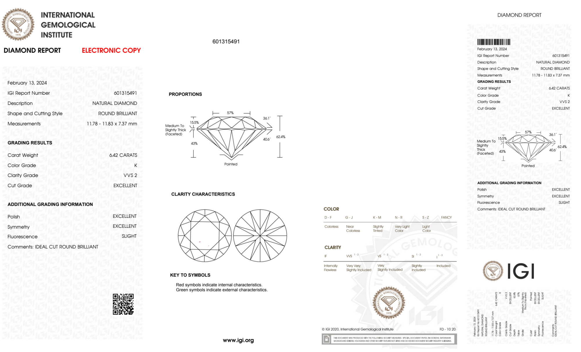 Your 6.42 carat Round natural diamond is graded K color (Faint Color), and you can read more about K color diamonds here.