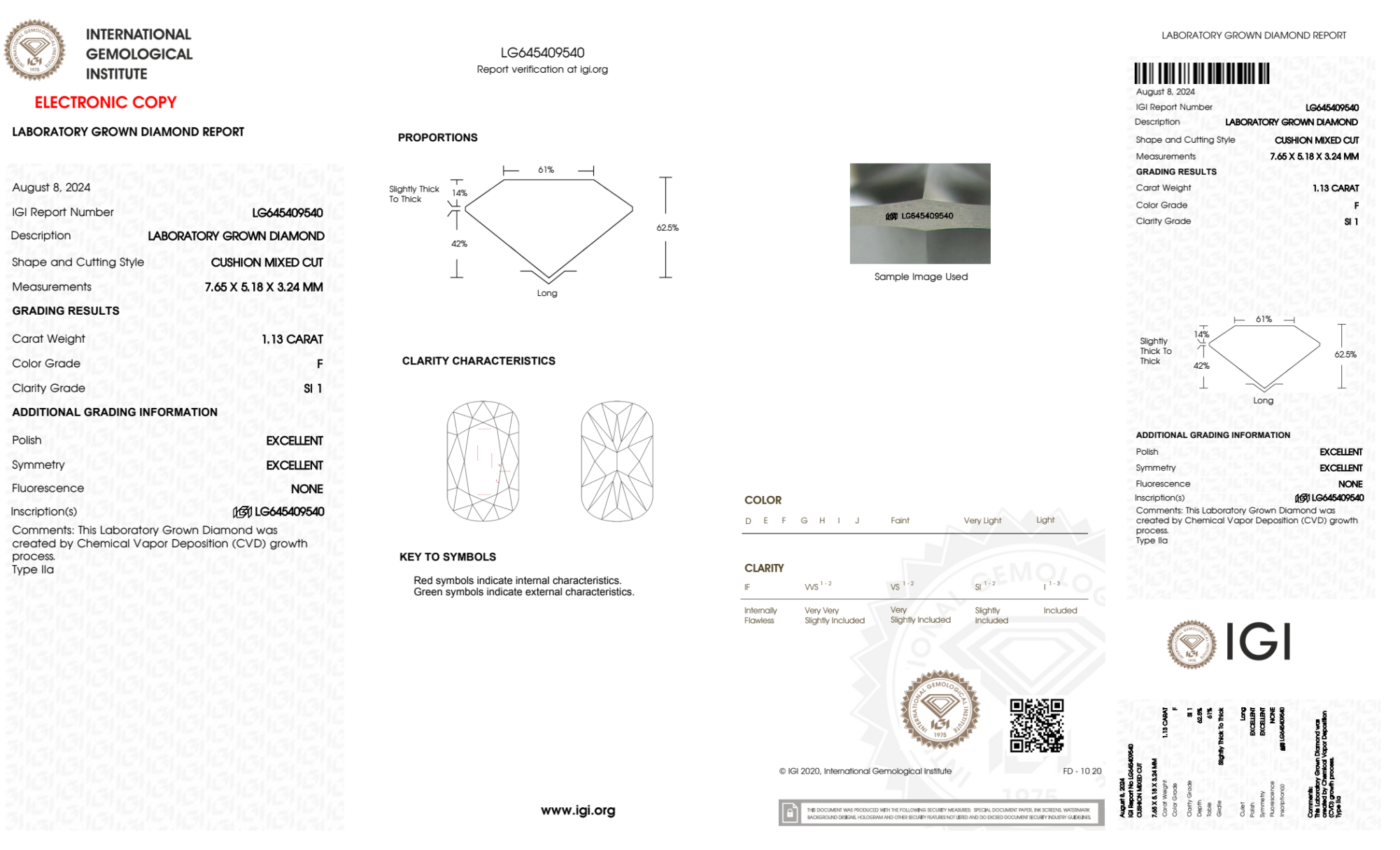 Your 1.13 carat Cushion lab diamond is graded F color (Colorless), and you can read more about F color diamonds here.