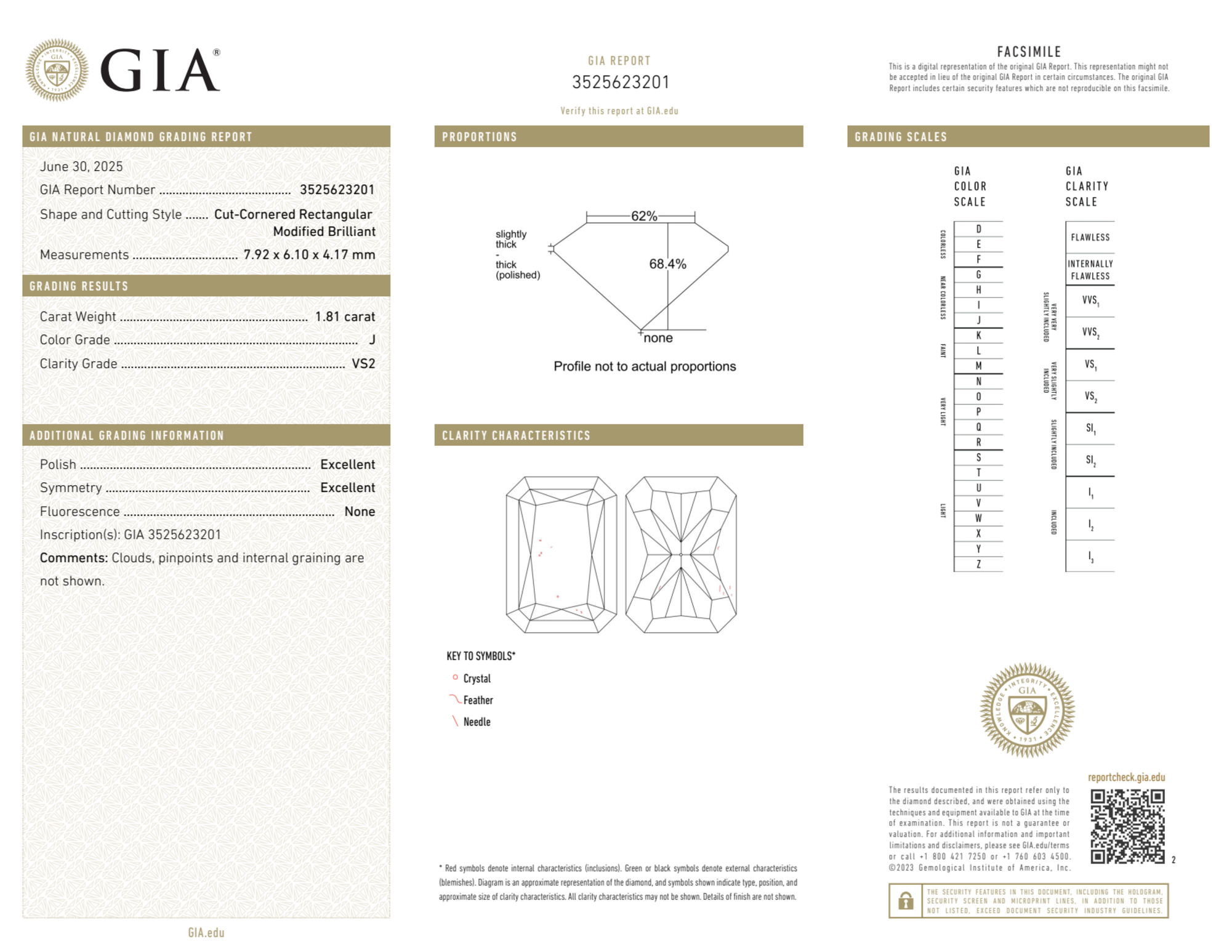 Your 1.81 carat Radiant natural diamond is graded VS2 clarity, which stands for Very Slightly Included 2. Read more about VS2 clarity diamonds here, or learn more about diamond clarity in general here.