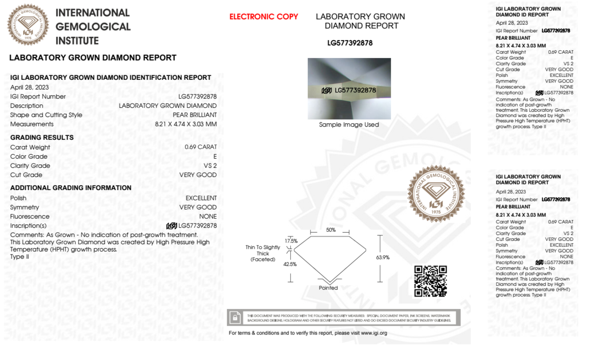 Your 0.69 carat Pear lab diamond is graded E color (Colorless), and you can read more about E color diamonds here.
