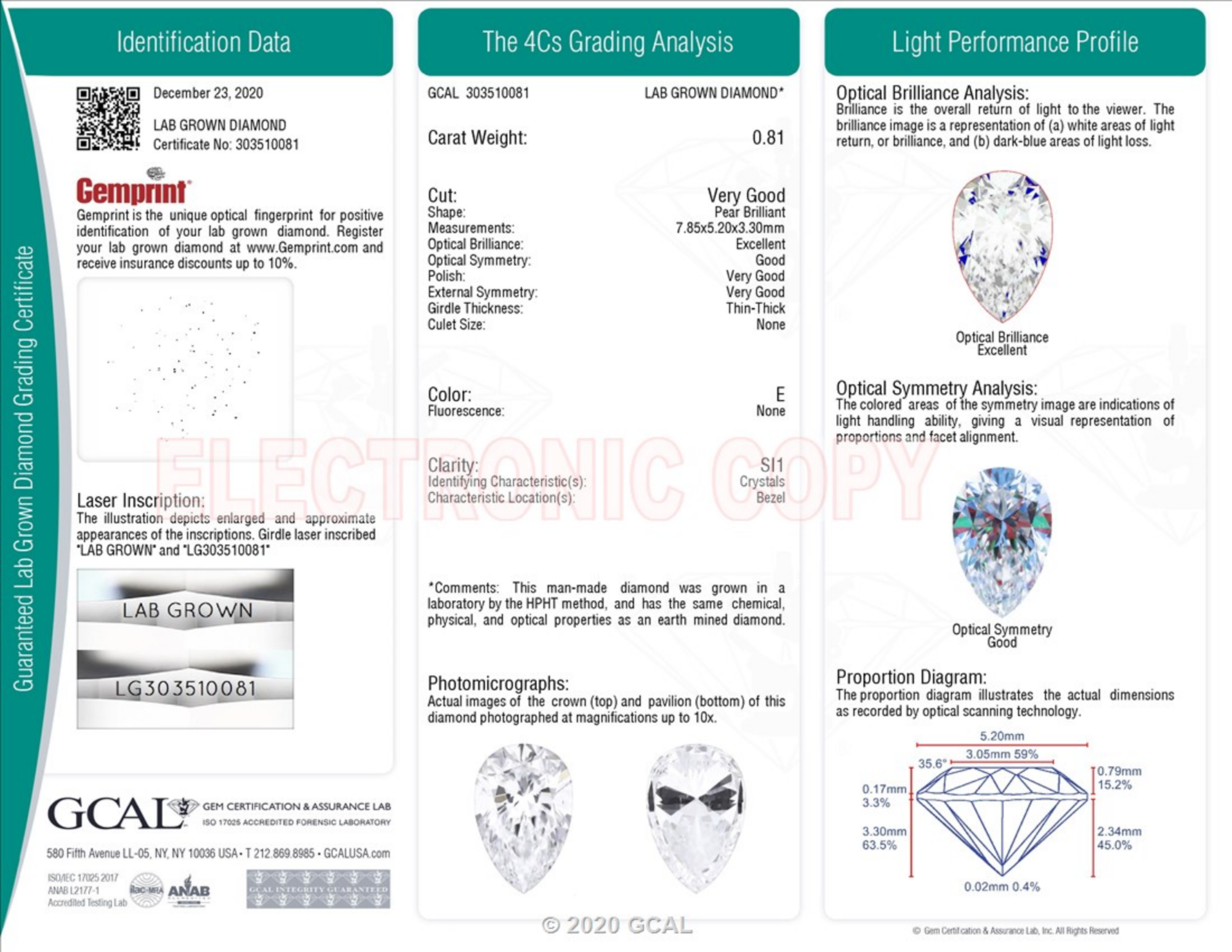 Your 0.81 carat Pear lab diamond is graded E color (Colorless), and you can read more about E color diamonds here.