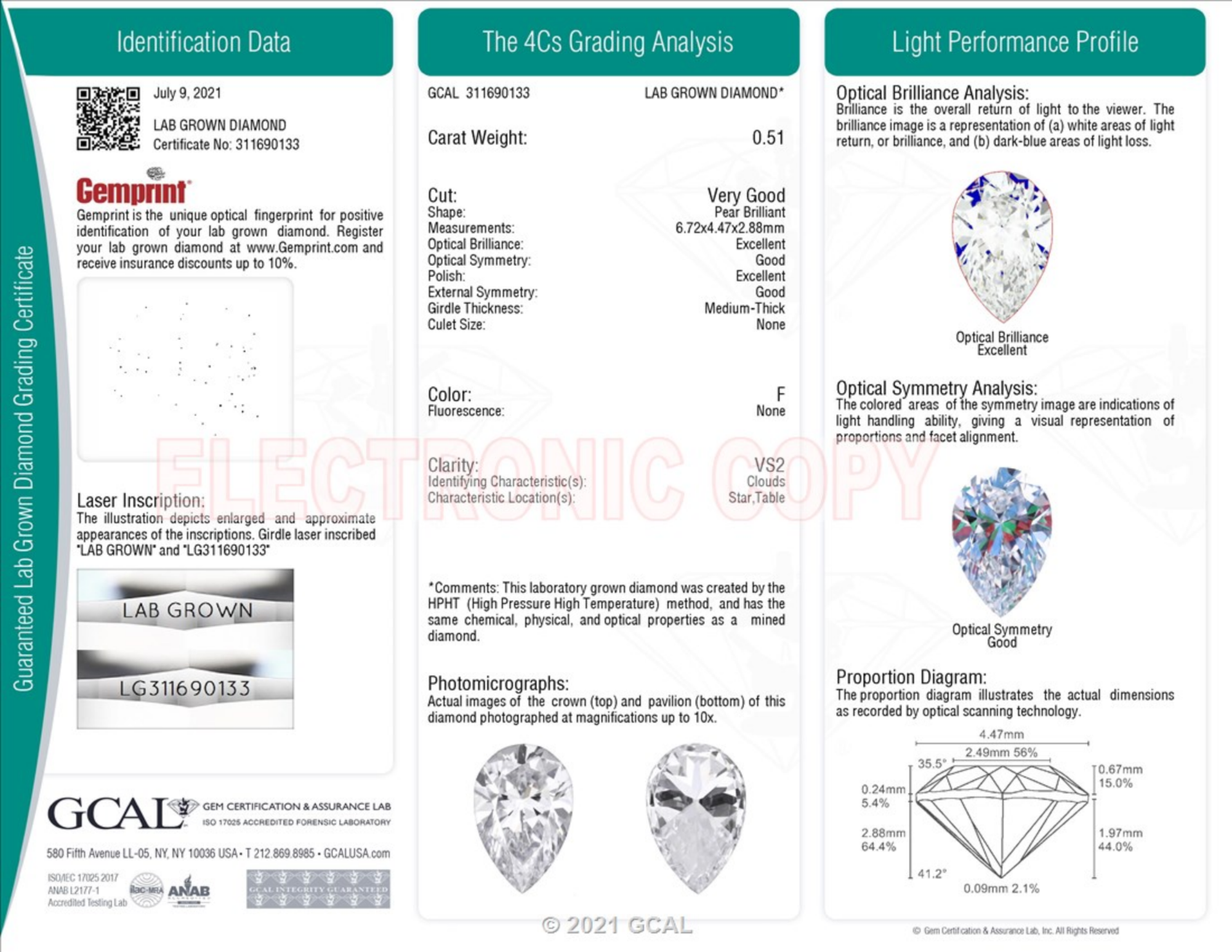 Your 0.51 carat Pear lab diamond is graded F color (Colorless), and you can read more about F color diamonds here.