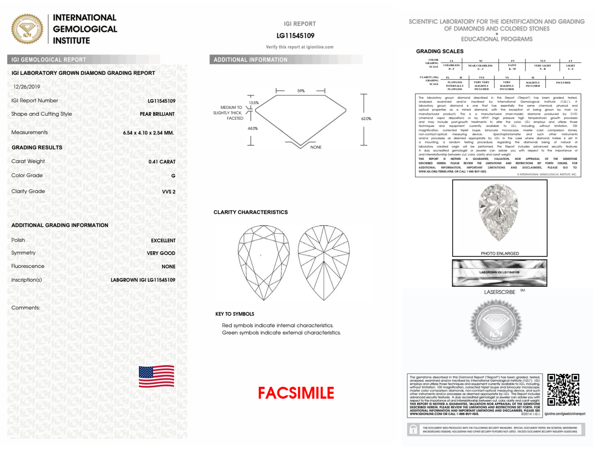 Your 0.41 carat Pear lab diamond is graded G color (Near Colorless), and you can read more about G color diamonds here.