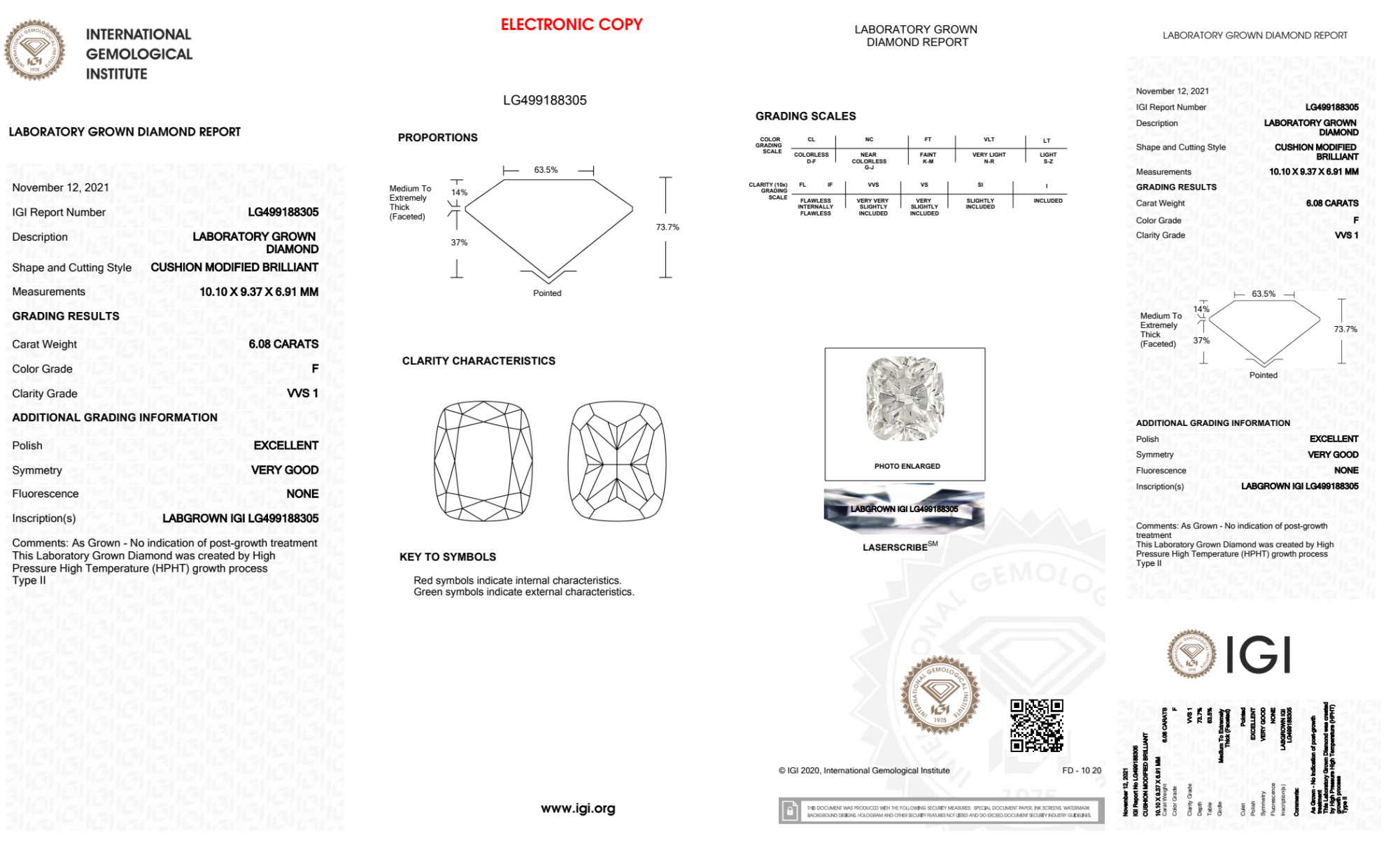 Your 6.08 carat Cushion lab diamond is graded F color (Colorless), and you can read more about F color diamonds here.