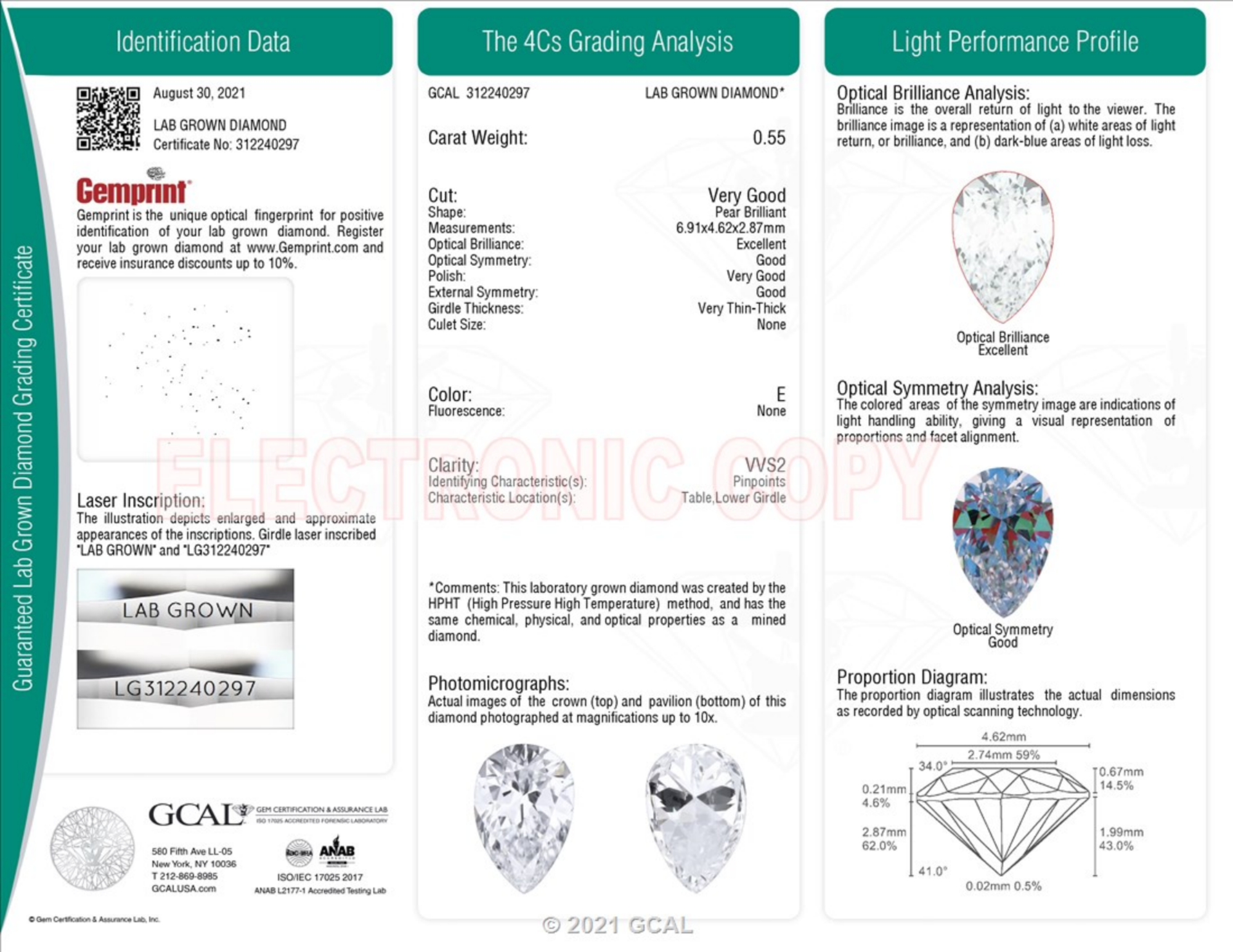 Your 0.55 carat Pear lab diamond is graded E color (Colorless), and you can read more about E color diamonds here.
