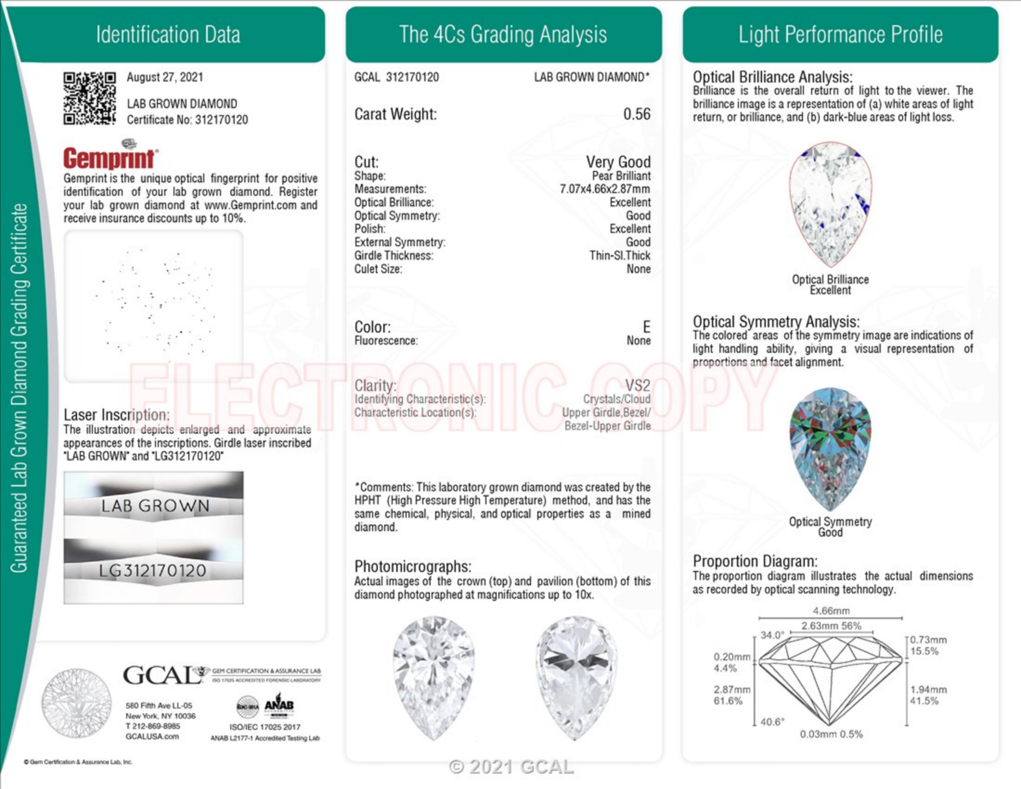 Your 0.56 carat Pear lab diamond is graded E color (Colorless), and you can read more about E color diamonds here.