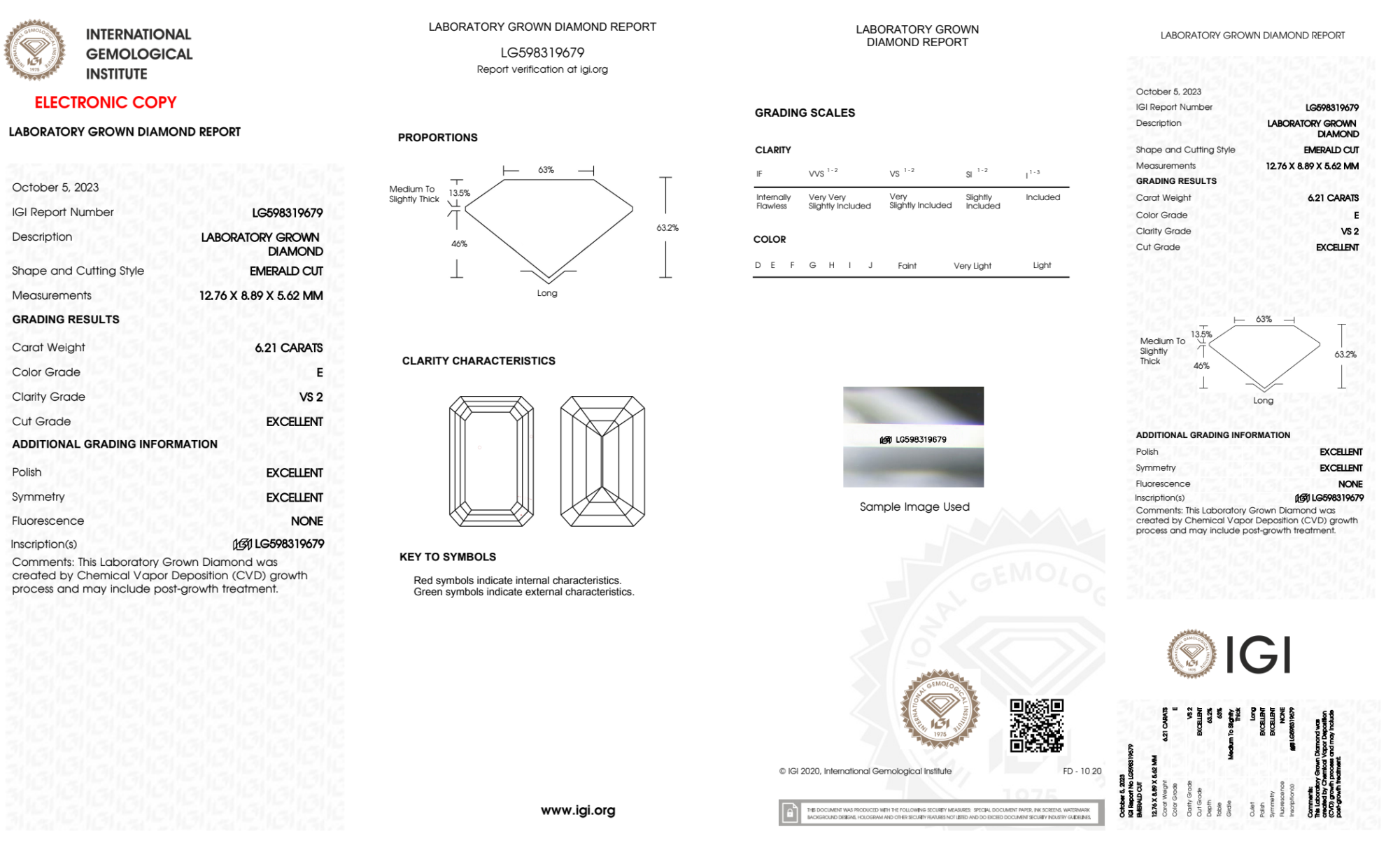 Your 6.21 carat Emerald lab diamond is graded E color (Colorless), and you can read more about E color diamonds here.