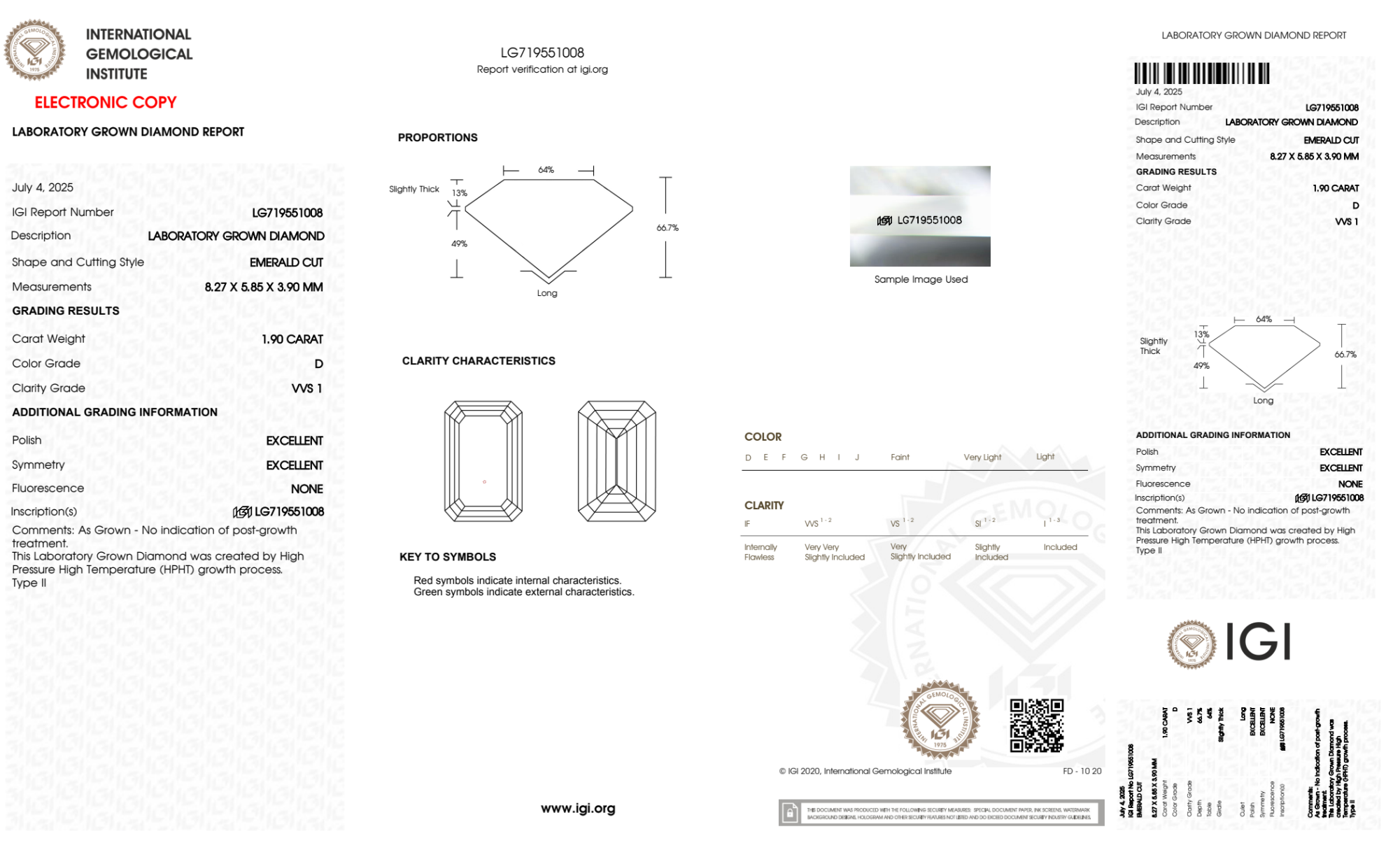 Your 1.90 carat Emerald lab diamond is graded D color (Colorless), and you can read more about D color diamonds here.